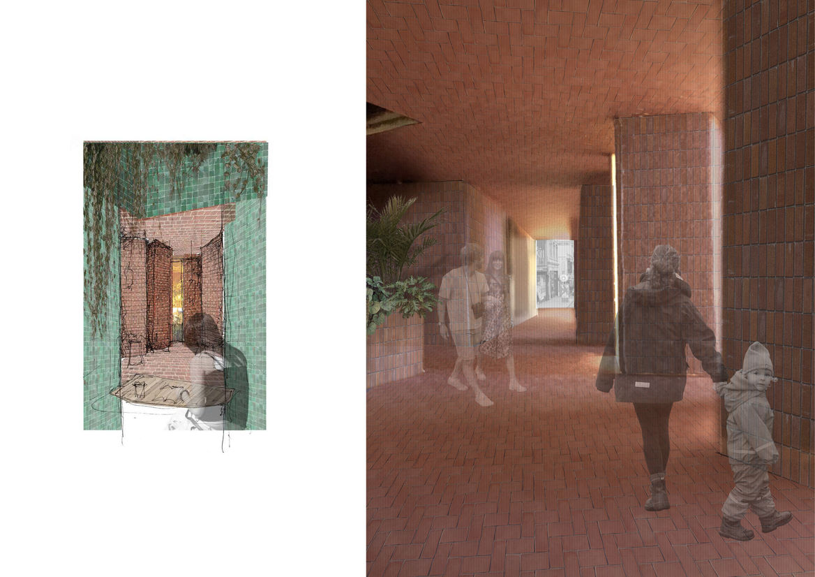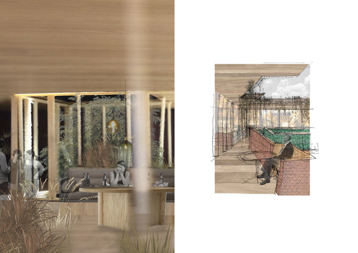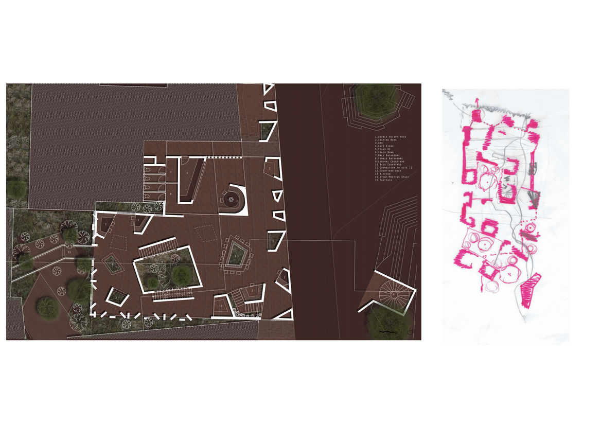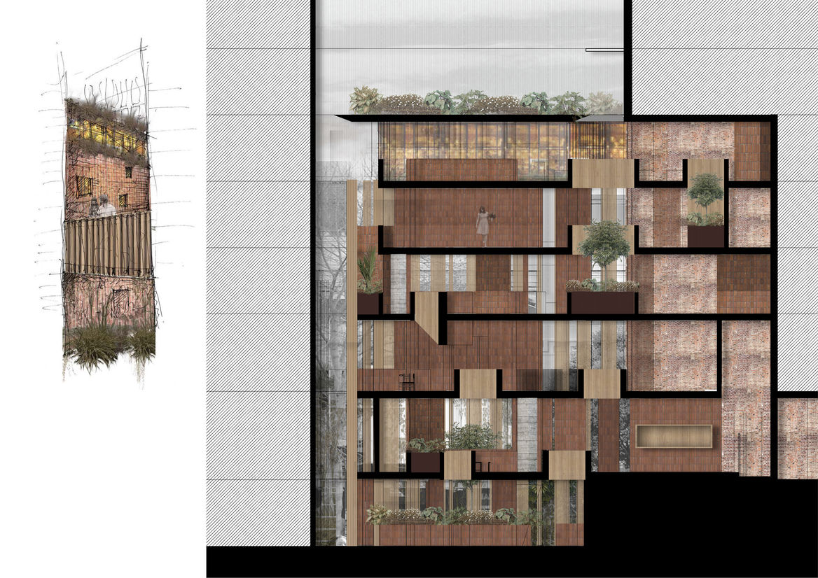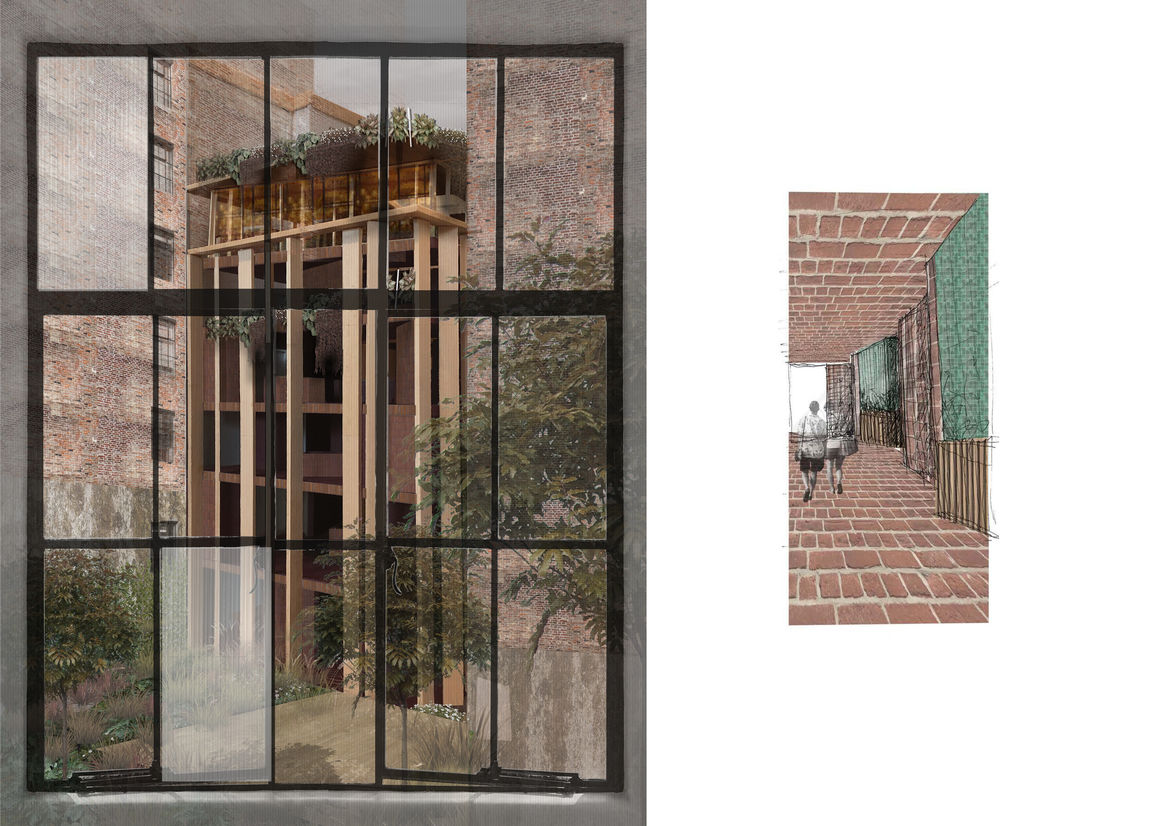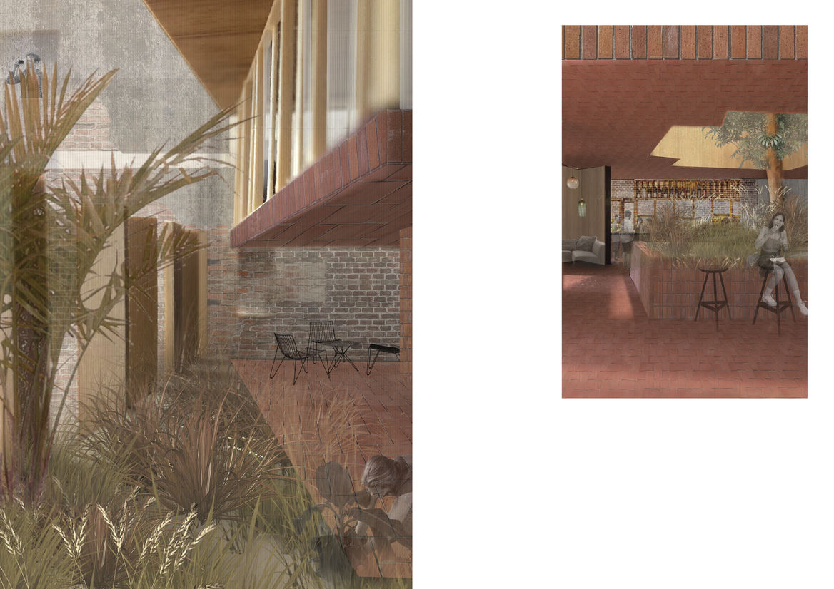 Through conceptual photographic recording, the materials implied in the project are derived from what is currently found on site. Though a gradient approach the lower floor is constructed in rough in situ concrete moving up though the building red brick, brick screens and ultimately the rooftop glass pavilion. The major tectonic move within the building is the central courtyard which has a stacked rectangular box form. This allows staircases to be integrated into the core with a dynamic movement of light through the building. The light shafts and courtyards are clad in a glazed tile allowing light to bounce down though the building creating flashes of colour and light amongst the concrete and red brick.