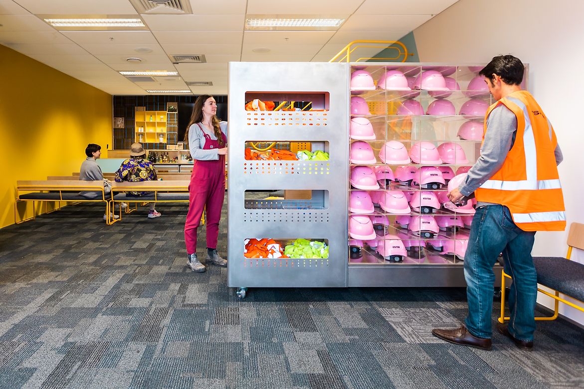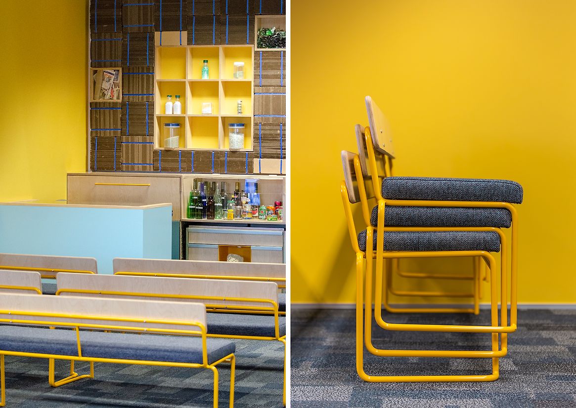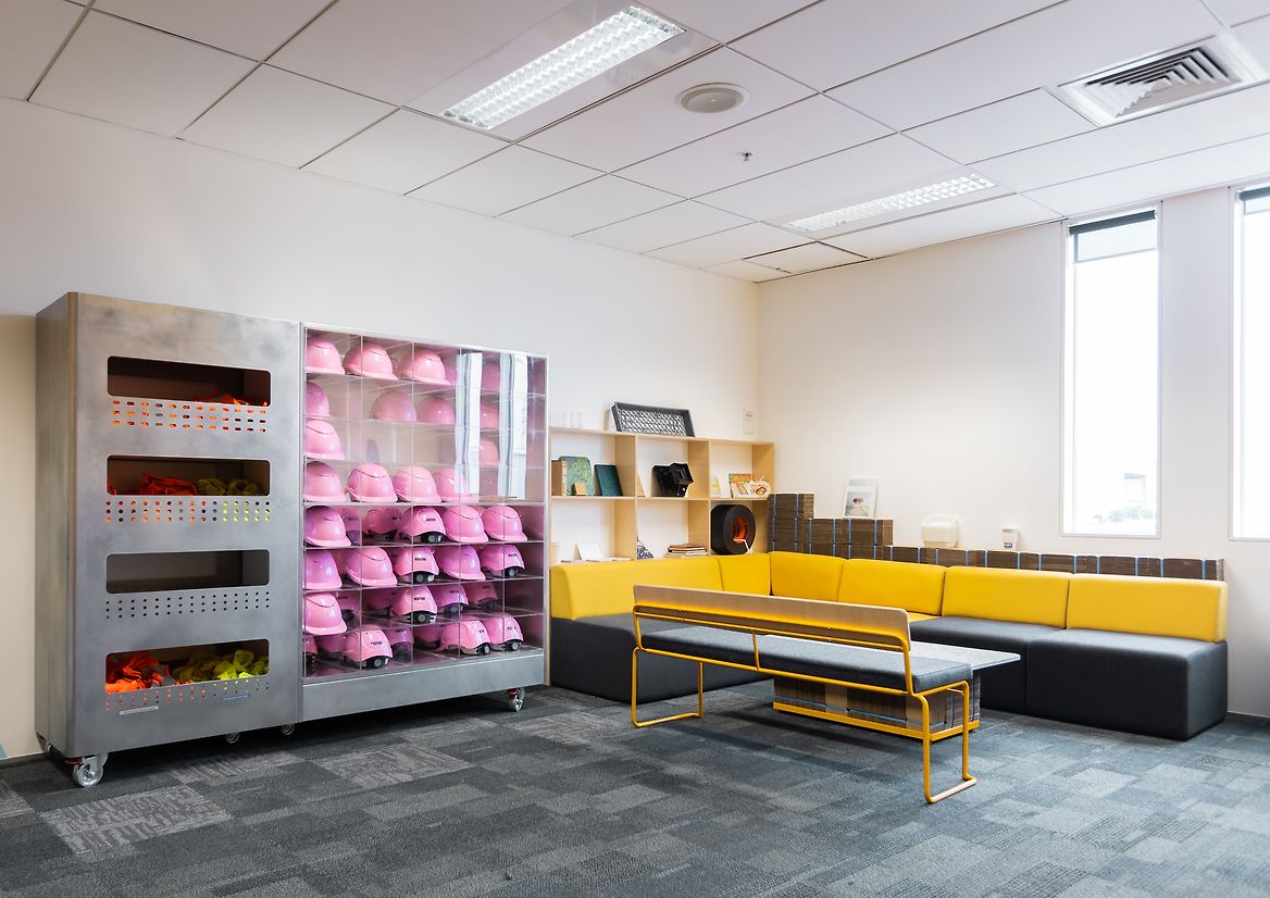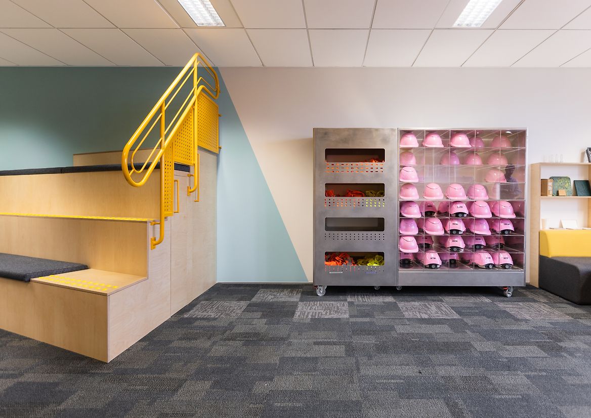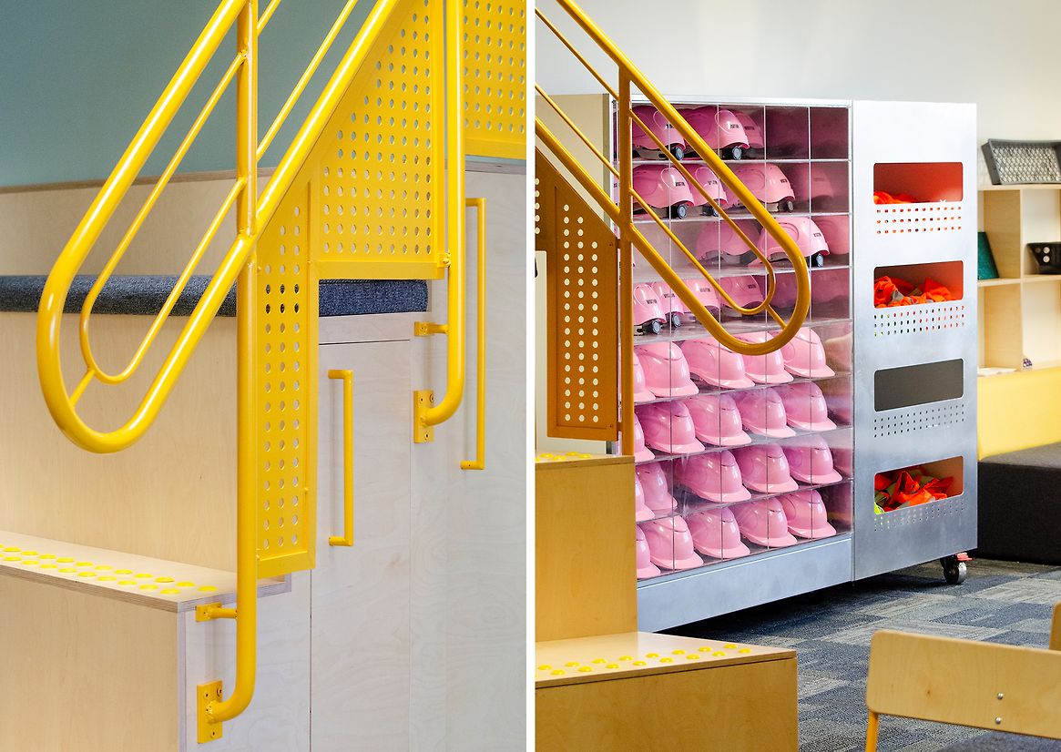 Firstly, colour was used to create an exciting and engaging atmosphere, creating structure without taking up space. Colours and forms inspired by the safety language of the Material Recovery Facility, such as bright "safety yellow" curved handrails and vivid blue ramps, were selected and playfully translated into the space. These were incorporated into various surfaces and components throughout the room, complementing existing elements like the pink hard hats.