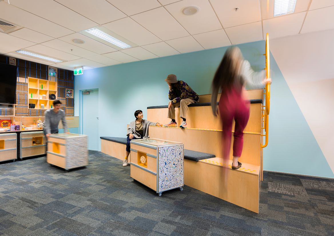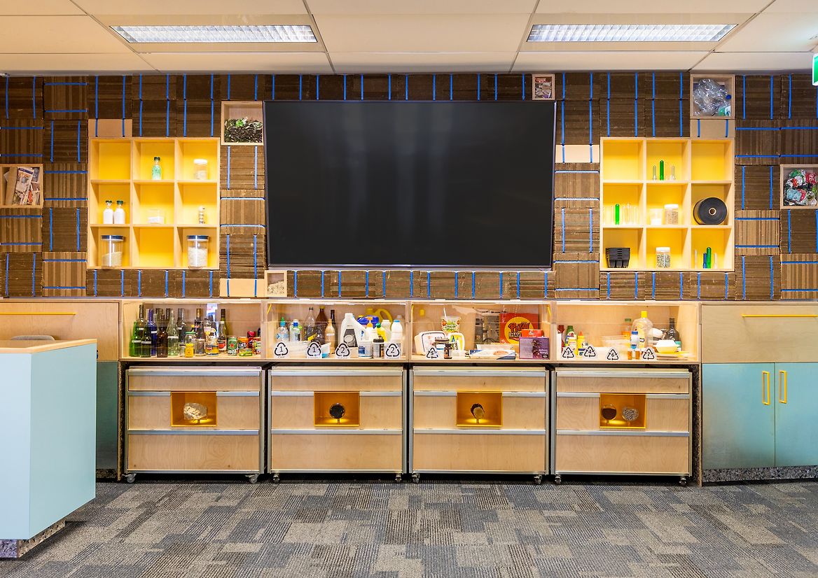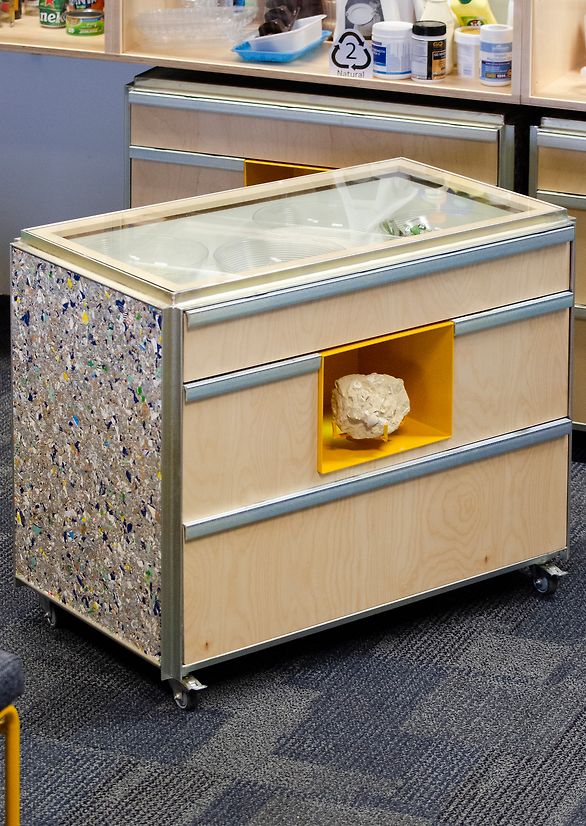 Secondly, the aim was to maximise the limited space and provide flexibility through multi-functional furniture and cabinetry. Mobile display units were designed as versatile teaching aids, featuring wheels with brakes, glass tops for displaying interchangeable recycling content, and drawers capable of accommodating teaching materials. Bench seats were constructed to be lightweight, enabling easy movement and stacking. Existing foldable tables and stackable chairs were retained so concealed storage was incorporated into the wedged-tiered seating for those to be stored.