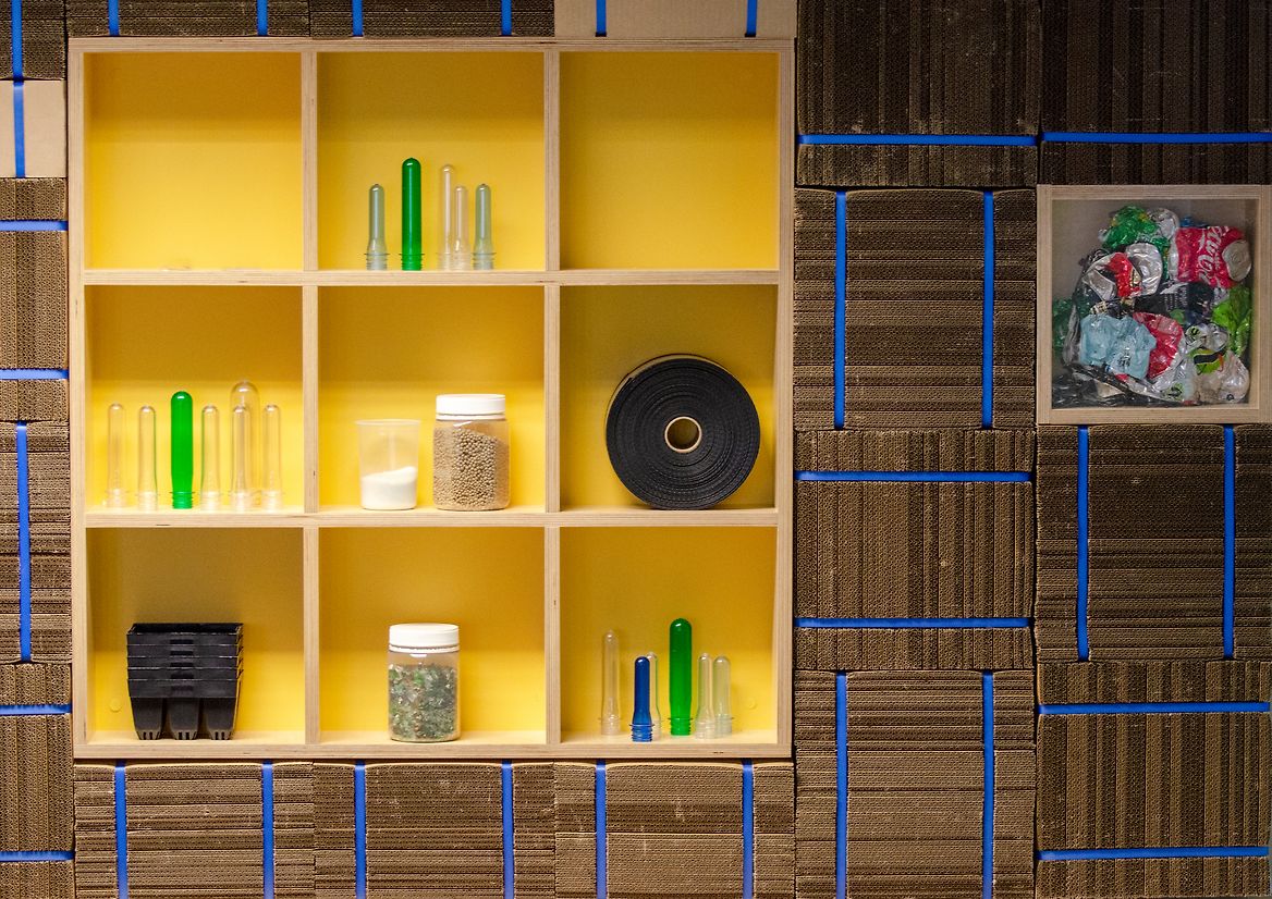 The project prioritises user-friendliness for all users, including educators and diverse audiences, using design as both an organisational and educational tool within the education space. The concept of recycling is showcased overtly and subtly through materials representing each stage of a product's lifecycle, from raw materials to transformed everyday items, and ultimately to sorted, compressed, or shredded materials for a second life. Openable acrylic flaps frame everyday recyclables that are in plain sight. Small snippets within the strapped cardboard brick wall, demonstrate the processing of materials within the MRF facility, such as shredded glass, fiber, compressed aluminium, and steel cans, enclosed in clear-fronted boxes. Finally, to close the loop, the origins of recycled waste products, materials like bauxite, iron ore, wood, crude oil, and limestone were incorporated into mobile display units, framed by vibrant ‘safety yellow’ boxes. These facilitated easy pointing during teaching sessions and helped create an immediate connection with the audience.