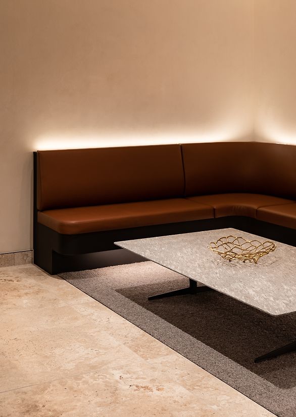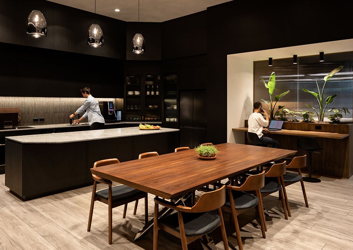 Upstairs, a spacious breakout area takes center stage. With its lofty ceilings, this space presented the perfect opportunity for Cachet to fully embody the client's identity. A custom feature panel with brass finishes adorns the tall wall, complemented by tan leather banquet seating and stone tables that mirror the kitchen island.