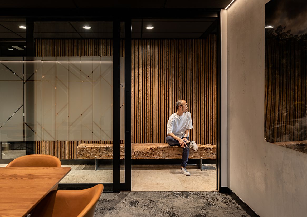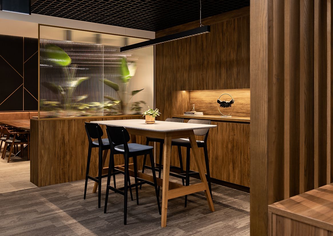 Upon entering, visitors are greeted by a floor-to-ceiling custom joinery unit adorned with artwork, elegantly illuminated by feature lighting. A cozy lounge area is situated around the corner, complete with a kitchenette inspired by a whiskey bar and softly lit by recessed ambient lights, drawing them in. The arrival space is thoughtfully designed with expansive black grooved paneling allowing for ample space for client hosting but also concealing three discreet doorways that invite exploration further inside. Behind these doors are dedicated workspaces and meeting rooms featuring walnut timber joinery, live plants, and more captivating lighting that harmonizes with the overall concept.