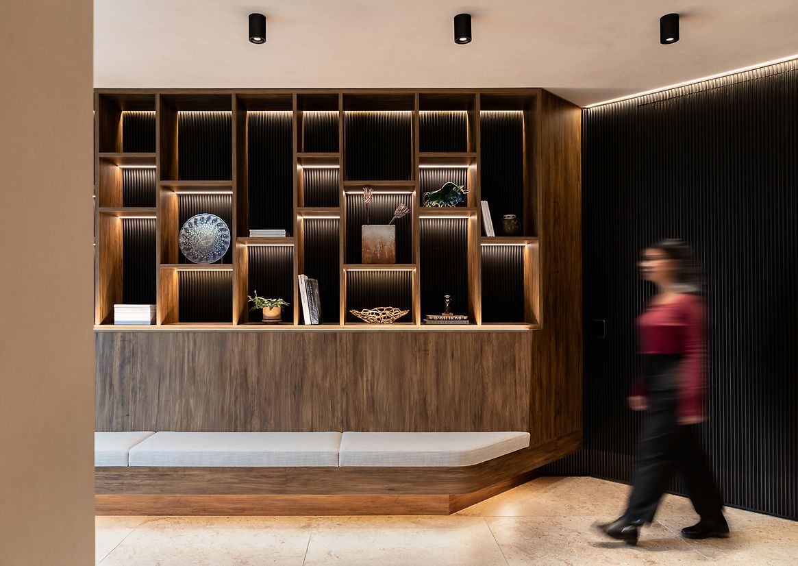 Moody, elusive, sophisticated and timeless, the design achieves this through the skillful use of black grooved paneling, warm walnut timbers, ambient lighting, and impeccably crafted joinery units embellished with brass accents. Each key area pays homage to these elements, starting right from the entrance area.