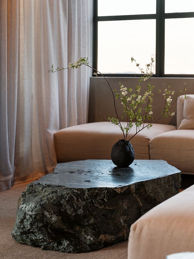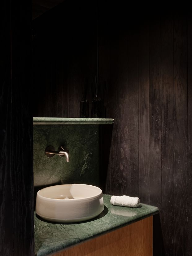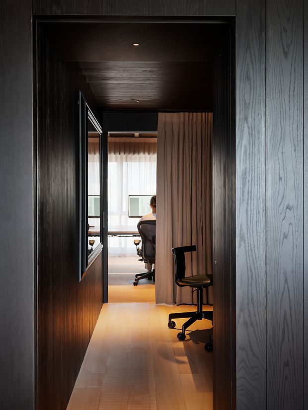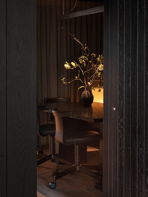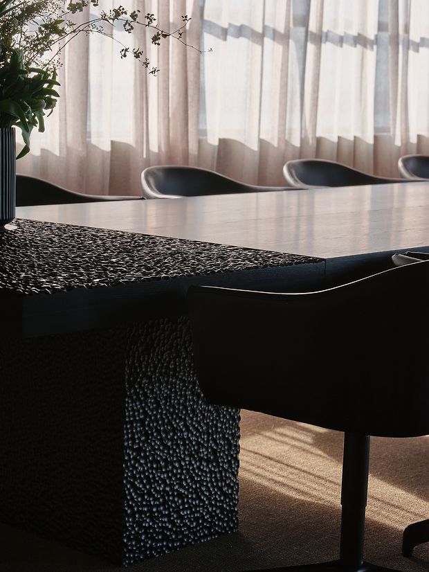 Lighting is never uniform and harsh, but soft and composed. Furnishings are generous and assert comfort, quality, craft and permanence. Each space is constructed from a reduced palette of natural and raw materials, providing a calm backdrop to a busy workplace; a warm and inviting place in which to share a working day, and an evening's entertaining.