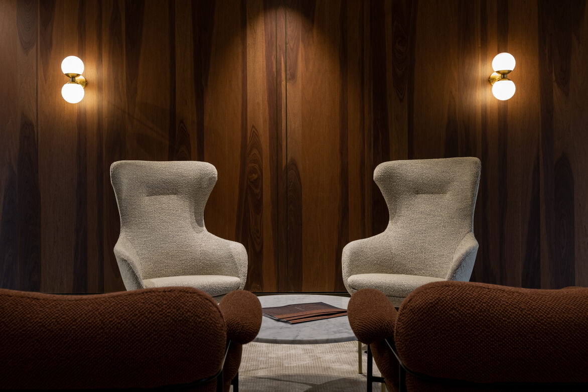 We have created a central space with seating in the lobby, called the ‘library’, and clad the flanking walls with floor-to-ceiling Smoked Walnut panelling. This is connected through brass inlays in the floor and mirrored recessed lighting tracks above. Custom shelving units nestle into curved reveals.