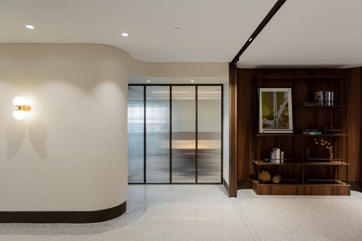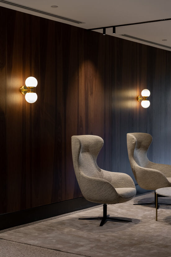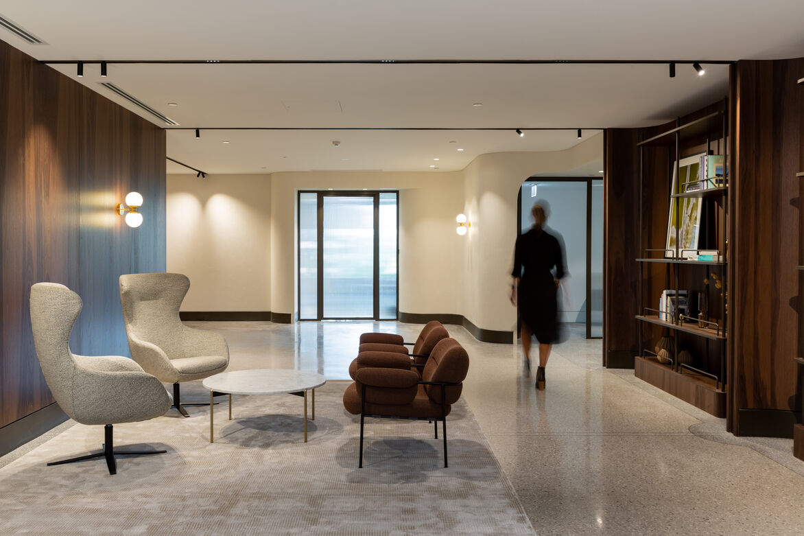 Ceiling and flooring details connect with the curves in the walls in the lobby space, and bulkheads overhead are mirrored in a brass trim running throughout the poured-in-situ terrazzo floor. We have created a central space with seating in the lobby, called the ‘library’, and clad the flanking walls with floor-to-ceiling Smoked Walnut panelling. This is connected through brass inlays in the floor and mirrored recessed lighting tracks above. Custom shelving units nestle into curved reveals.
