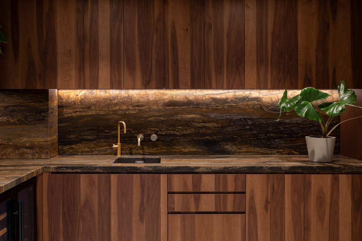 We decided to use a selection of classic and sophisticated materials that might be found in some of the top office spaces in London’s Kensington or Chelsea. Shinnoki Smoked Walnut panelling and reeded glass are reminiscent of a classic London boardroom, while Terrazzo floors are suggestive of top London banks.