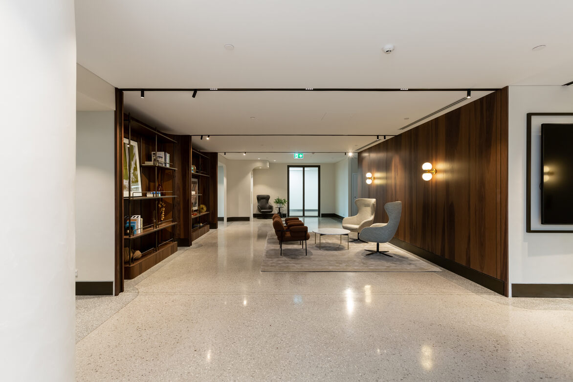In particular, the expectation was that visitors to the building should experience an exceptional “Wow” moment when exiting the lifts and entering the offices. The client wanted the design to place a strong emphasis on quality materiality and sophisticated detailing.