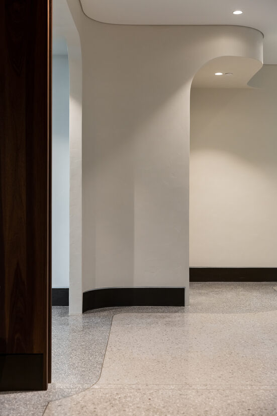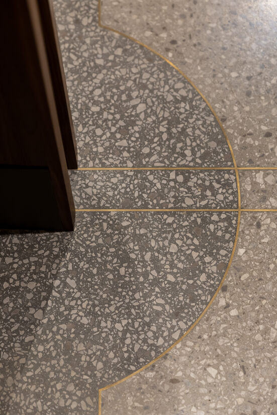 Ceiling and flooring details connect with the curves in the walls in the lobby space, and bulkheads overhead are mirrored in a brass trim running throughout the poured-in-situ terrazzo floor.
