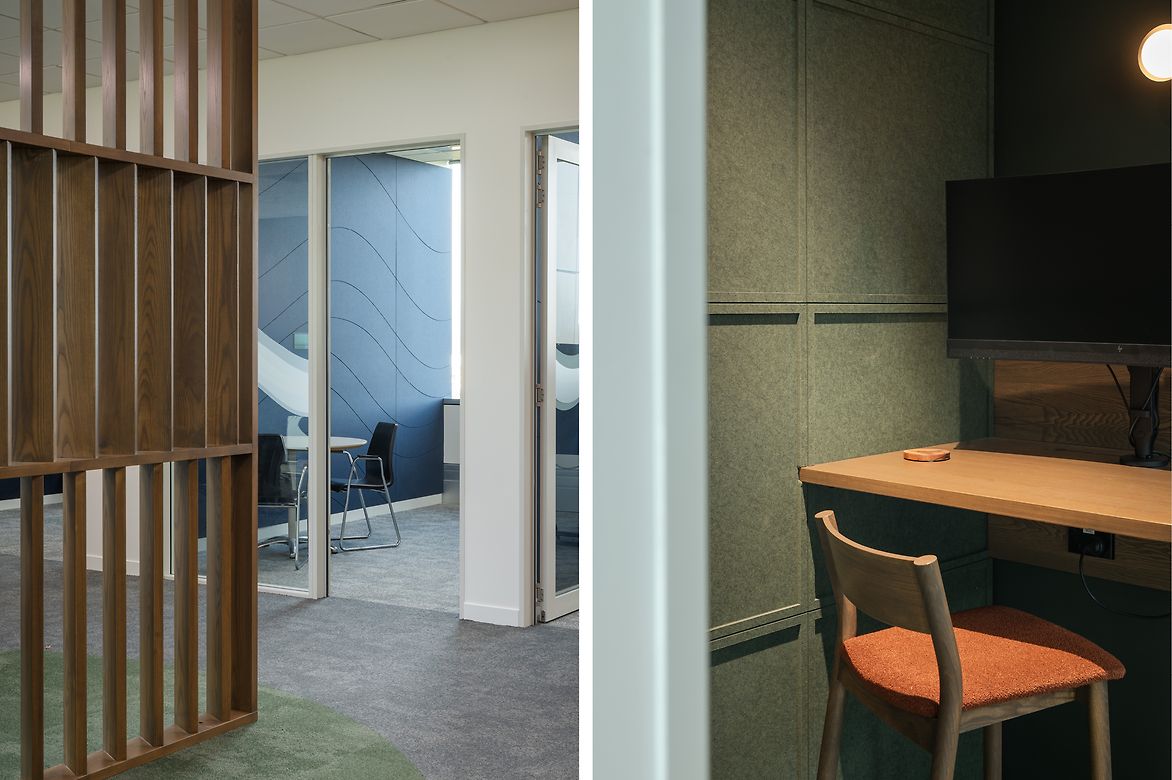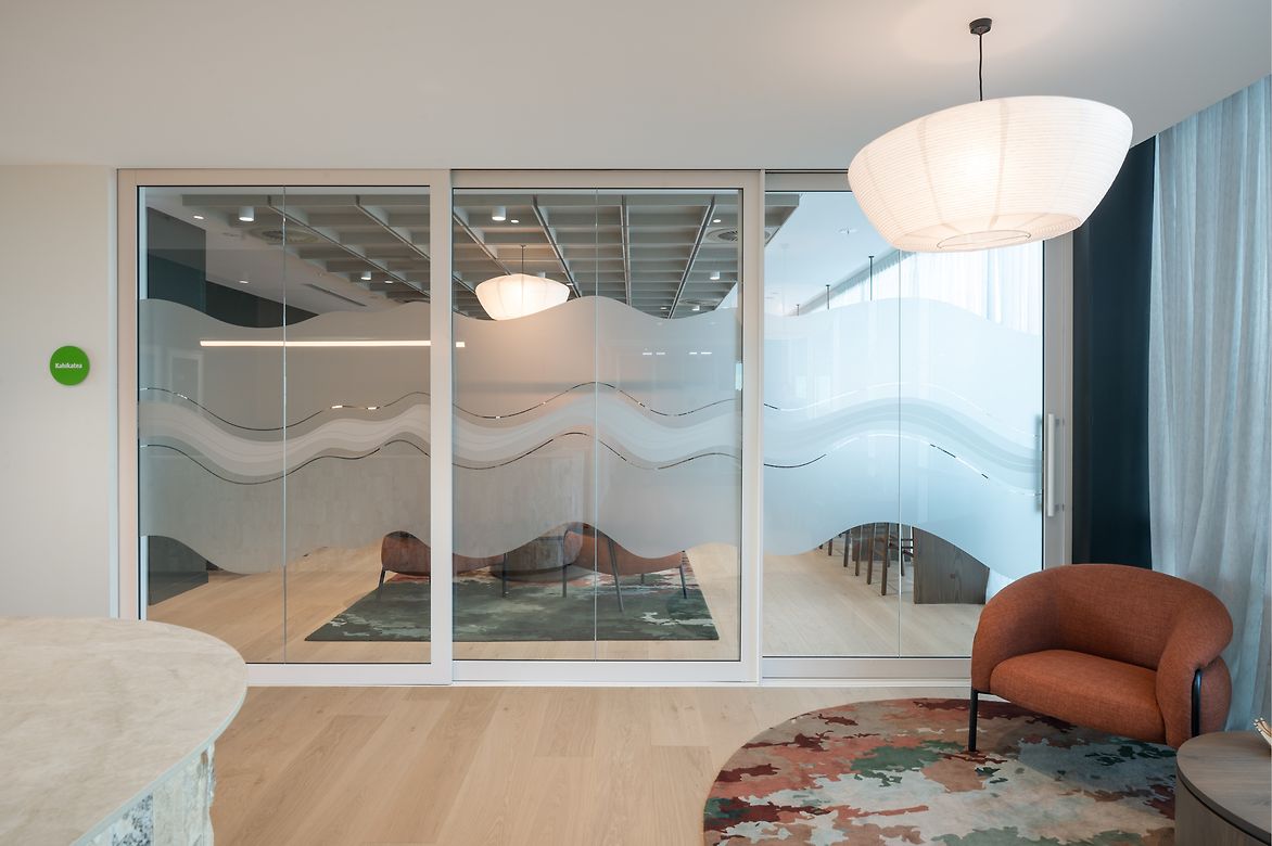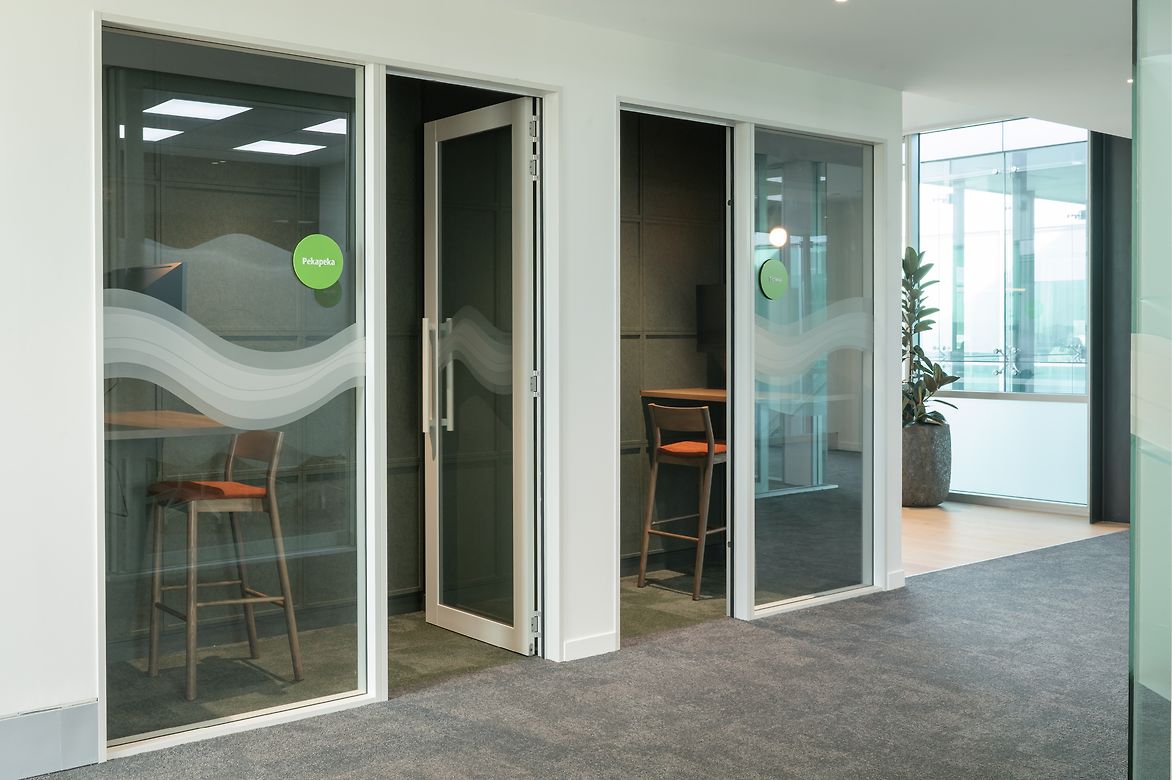 Materials and details reflect the Waikato context: warm kōkōwai tones echo natural clay pigments found in local gully systems, while Hinuera stone-inspired tiles reference the texture of the riverbanks. Custom glass graphics and wayfinding throughout the space draw from the flow of the river, and meeting rooms are named after native flora and fauna found along its edge—each paired with bespoke artwork and photography to embed the narrative in a tangible way.