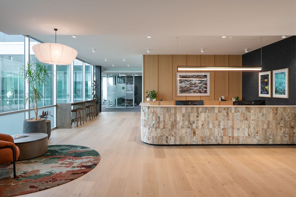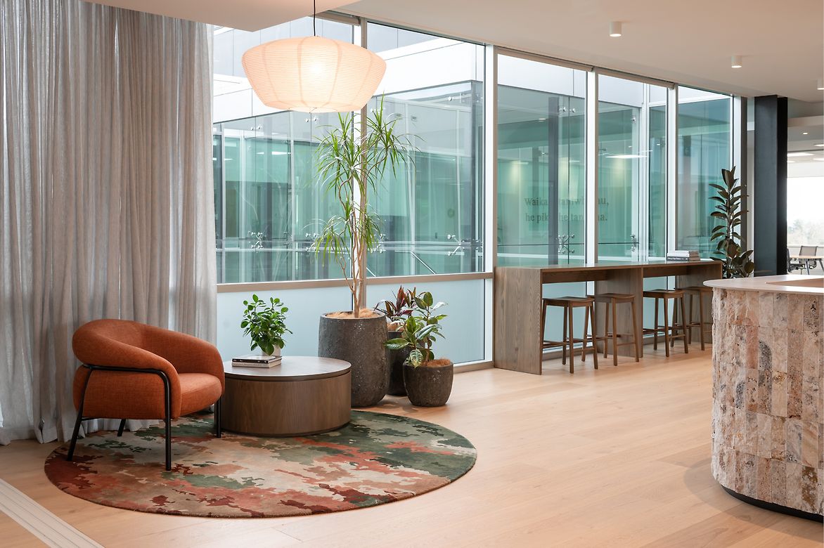 Deloitte Hamilton’s workplace refurbishment is a confident reinvention of a tired and inefficient office into a future-focused environment that reflects the firm’s identity, values, and deep connection to place. Located in a prime position overlooking the Waikato River, the office offers sweeping views north and south—creating a daily connection to the awa that grounds both staff and visitors. This relationship to the river inspired the overarching design narrative. Drawing on the symbolism of the riverbanks as guides and protectors, the workplace was conceived as a spatial journey—flowing from public client zones to team workspaces. The previously oversized foyer has been transformed into a warm, flexible hospitality space—used daily by staff and easily adapted for client events, training, and hosting. This marks a major shift in how the Hamilton office engages with both its people and its community—bringing generosity, connectivity, and brand expression to the heart of the experience. Materials and details reflect the Waikato context: warm kōkōwai tones echo natural clay pigments found in local gully systems, while Hinuera stone-inspired tiles reference the texture of the riverbanks. Custom glass graphics and wayfinding throughout the space draw from the flow of the river, and meeting rooms are named after native flora and fauna found along its edge—each paired with bespoke artwork and photography to embed the narrative in a tangible way. The result is a high-performing workplace that delivers flexibility, cultural relevance, and a strong sense of identity. It supports connection, attracts talent, and strengthens Deloitte’s role as a trusted, embedded partner in the Waikato.