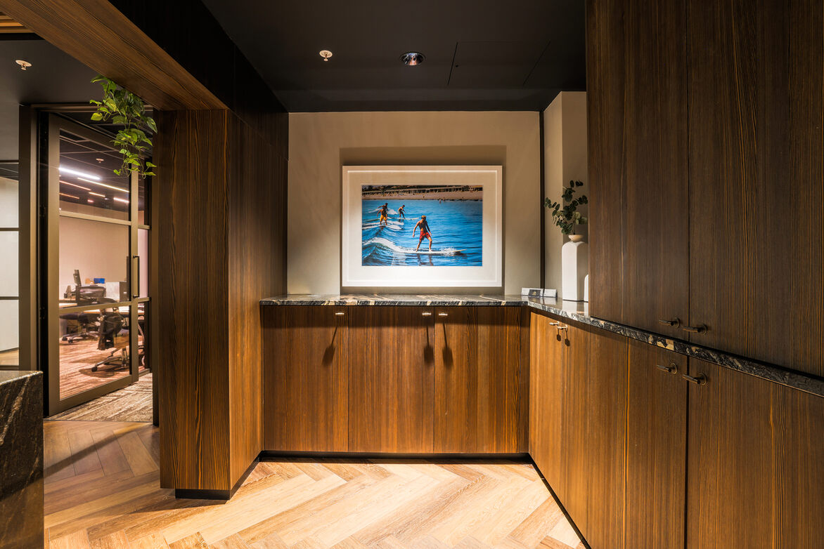 Bronzed windows, spring larch stained a deep honey colour and burnished bronze door hardware where specified and key elements for the finish’s palette. Sensory care to the design was a key factor to the thought process. The touch and feel of the knurled cabinetry handles, the smell of lanolin from the handmade woollen pendant lights the soft music being played tying into the 1950’s photographic art chosen for the space. The option to celebrate a glass of wine or bubbles is also there and showcased in the wine display that was designed to create those separate spaces desired for the full use of the150sqm office space