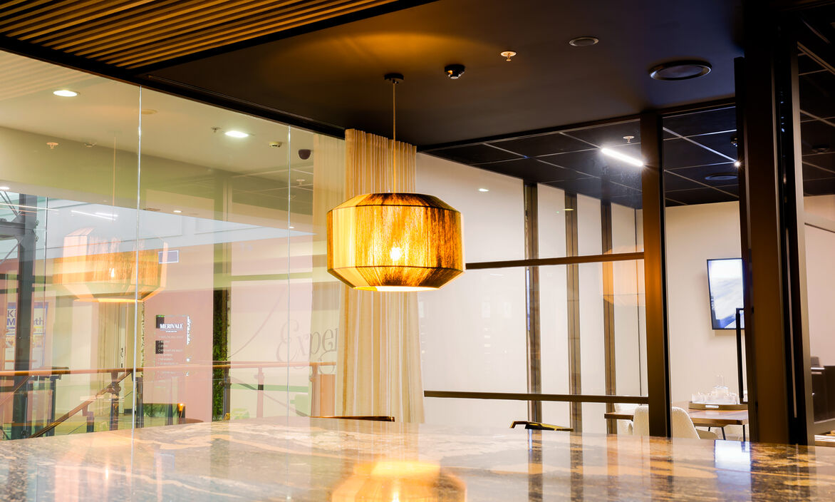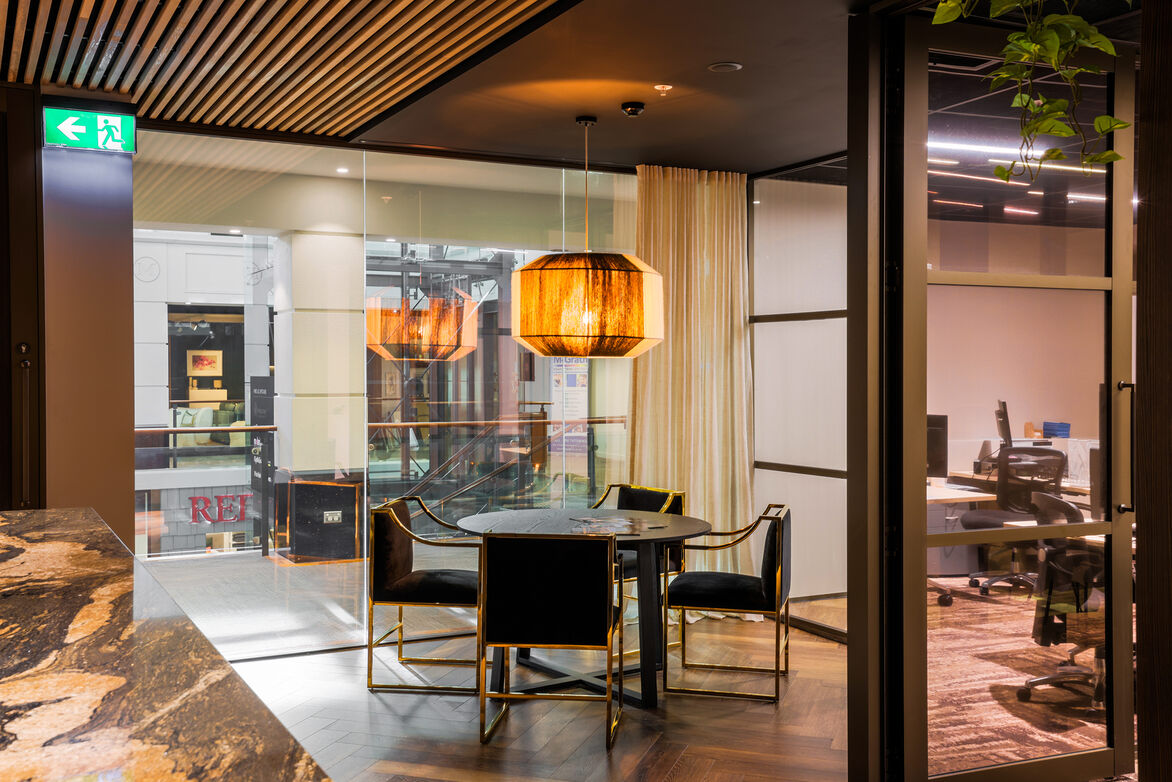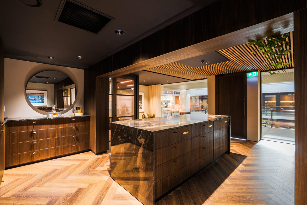 Executive Real Estate sells high end residential developments in New Zealand and Australia and leased a space on the first floor of Merivale Mall, Christchurch. With a space to work with totaling 150sqm the opportunity to create a warm commercial aesthetic for the business that didn’t look like a show home was key to the design brief. The desire was a space that reflected the quality of the offering and the comfort of home to put the companies’ clients at ease. Not only a working office for the sales team but a meeting space for deals to be done and a celebratory space to say cheers once the paperwork has been signed. Bronzed windows, spring larch stained a deep honey colour and burnished bronze door hardware where specified and key elements for the finish’s palette. Sensory care to the design was a key factor to the thought process. The touch and feel of the knurled cabinetry handles, the smell of lanolin from the handmade woollen pendant lights the soft music being played tying into the 1950’s photographic art chosen for the space. The option to celebrate a glass of wine or bubbles is also there and showcased in the wine display that was designed to create those separate spaces desired for the full use of the150sqm office space A large slab of beautiful chocolate and gold marbleised stone catches the light and is cool to the touch. It is an anchor to the space. A tryptic CNC cut stylised bronzed map of Christchurch on the front of the offices represents the solid and long-term commitment to the location from the business. 3 different ceiling finishes in this boutique office showcase the level of detail that our client is willing to go to for their clients to show them what they can do when creating high level homes. Herringbone laid timber flooring matched with a basket weave commercial carpet tile further indicates the wide range of finishes available for selection. All the finishes chosen are a mix of commercial and residential fixture finishes and fittings to create a cohesive interior for this commercial space used to sell and celebrate high end residential property.