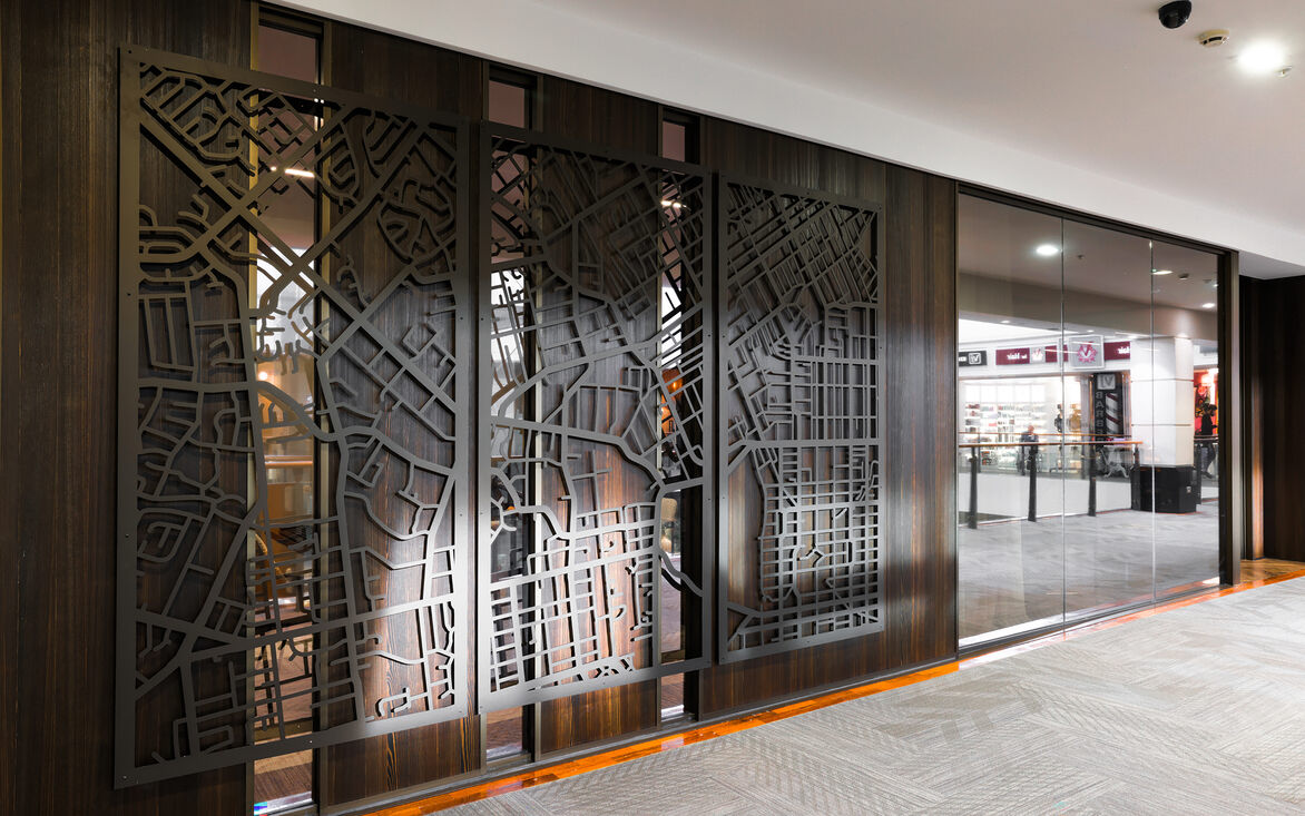 A large slab of beautiful chocolate and gold marbleised stone catches the light and is cool to the touch. It is an anchor to the space. A tryptic CNC cut stylised bronzed map of Christchurch on the front of the offices represents the solid and long-term commitment to the location from the business.
