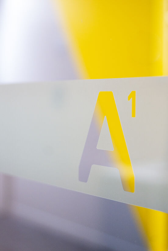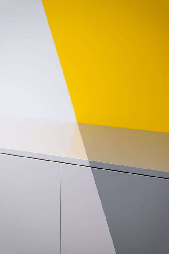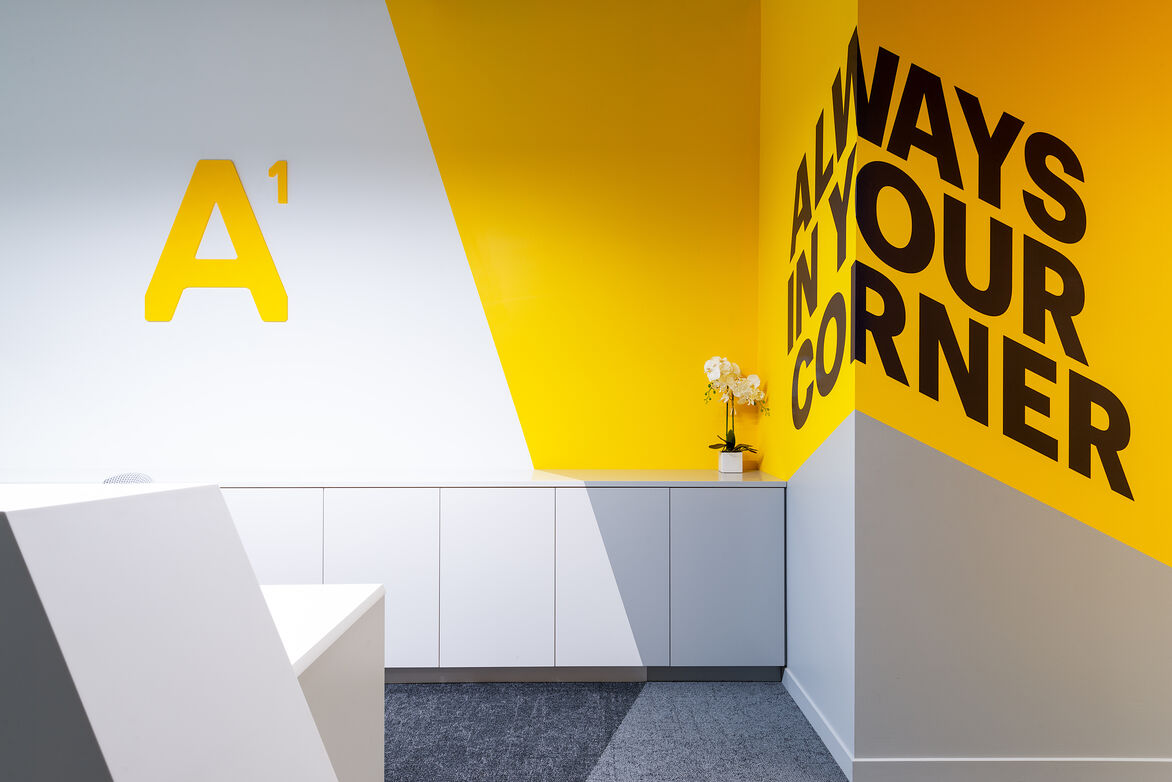 The primary branding colours - slate grey, yellow and white were chosen to give the brand and built environment a modern feel and a strong, confident identity. The interior is enhanced by graphic elements that add visual interest to the space. The angular forms from the brand are used to great effect throughout the renovated building. In reception a clever visual connection is created between the various materials, using the restricted colour palette (yellow and grey). Technically challenging yet achieving a stunning result.