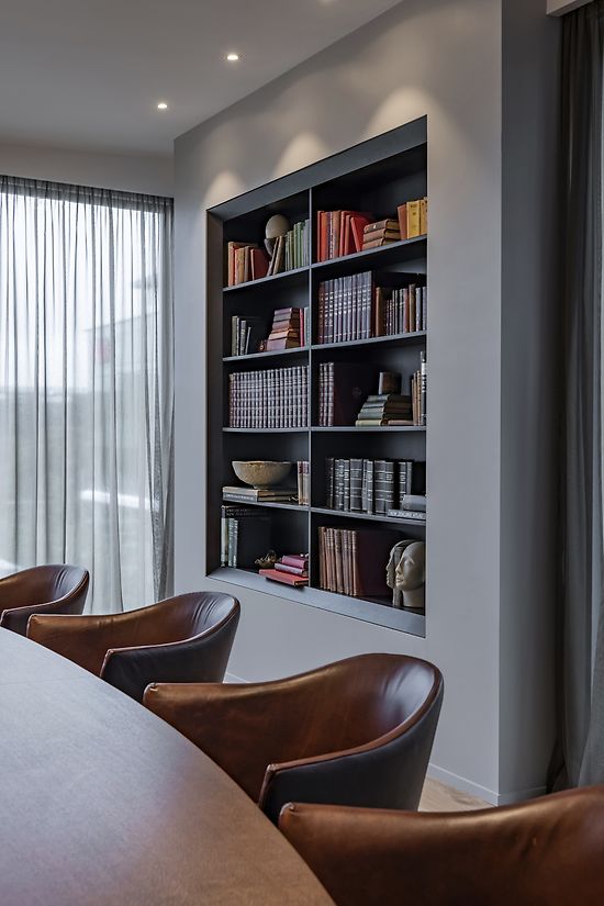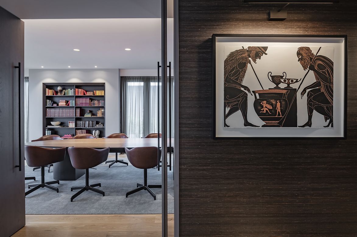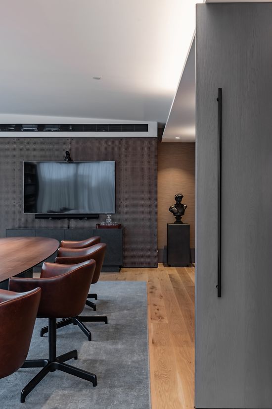The project consists of two wings on the top floor of the building. The brief for the South Wing was for a busy working office – then raising the bar with superb functionality and sophistication. Re-imagining the office interior as not simply functional, but uplifting and elegant, with a touch of luxury. This vision then needed to be carried over to the apartment across the lobby, converting the spaces and connecting this new North Wing to the larger office area.