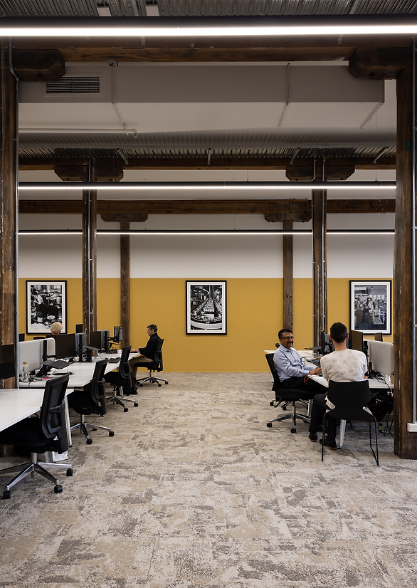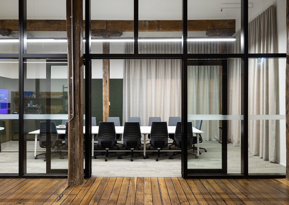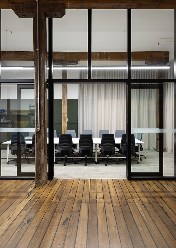The design of the new office space took into consideration the beautiful timber columns and beams, and embraced the high ceilings and exposed brickwork in the space. Throughout the design process, soft furnishings were carefully selected to address the acoustic challenges inherent in working in a historical building. This thoughtful approach ensures a comfortable and productive environment for all who occupy and visit the space. A deliberate use of Autex panelling and full height drapery help to soften the space, with the panelling curated to complement the painted datum within the space.