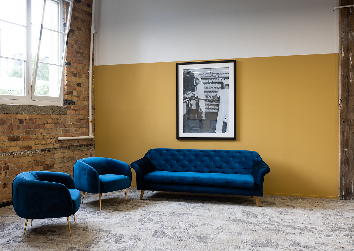 The colours used in the space enhanced the overall style and design of the fitout. A rich, warm mustard was painted as a datum around the entire tenancy, creating visual connection through the open plan environment and complementing the double volume space. The colour integrated with the eclectic look and feel of the design. It also created a beautiful backdrop for the oversized black and white photographs of the original Compass kitchens helping to showcase the long history of the company. Additionally, the mustard colour was chosen to enhance the architectural space as well as invoke memories of being in your grandmother’s kitchen and enjoying a home cooked meal, subtly influencing the user experience.
