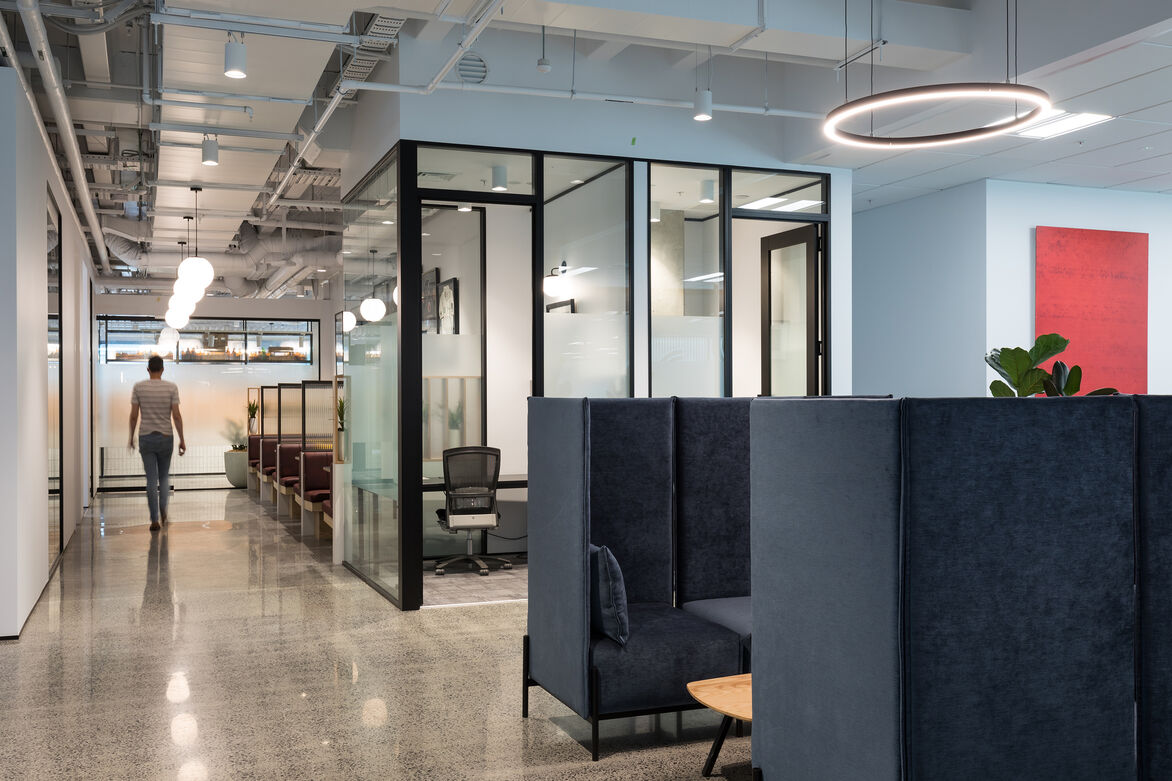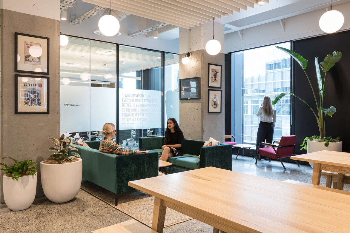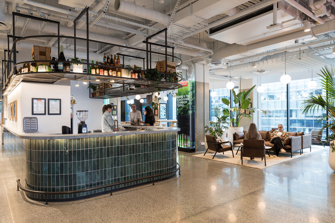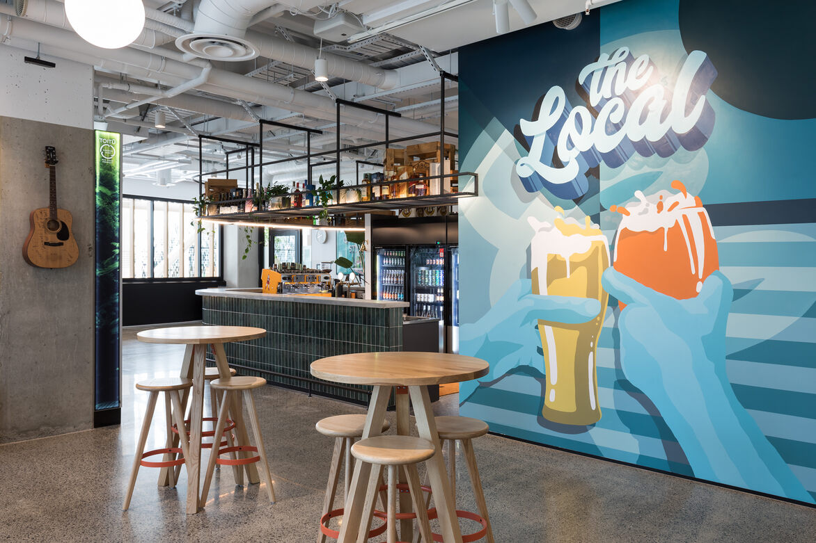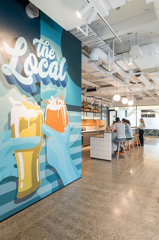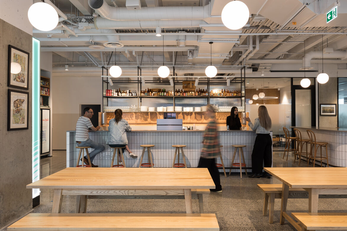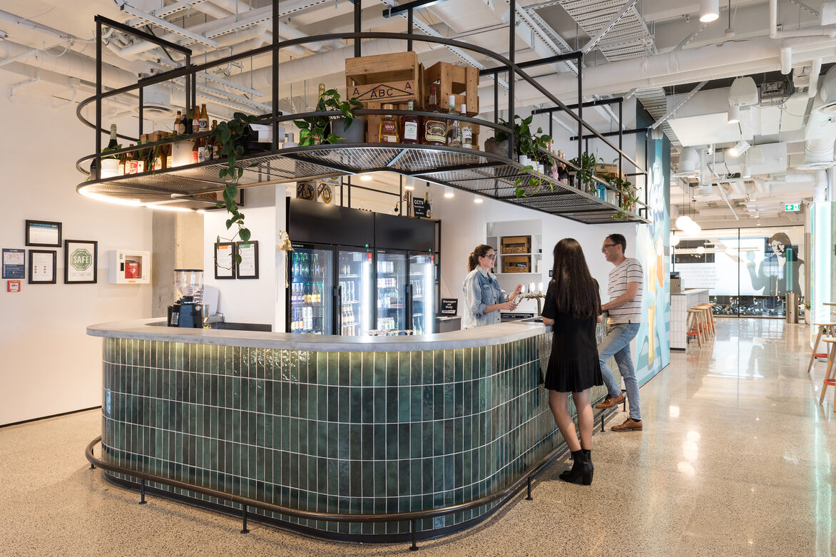 The tenancy comprises two spaces separated by an atrium, the idea and analogy of ‘the street’ was developed to link and connect the spaces. The functions and activities are accessed of this street: ‘the collective’, ‘the commons’ and ‘the studio’ creating linkages and connections. The ‘street’ was anchored at one end by ‘the collective’, a community space that is both client facing and the staff social and collaboration hub – and includes a bar!