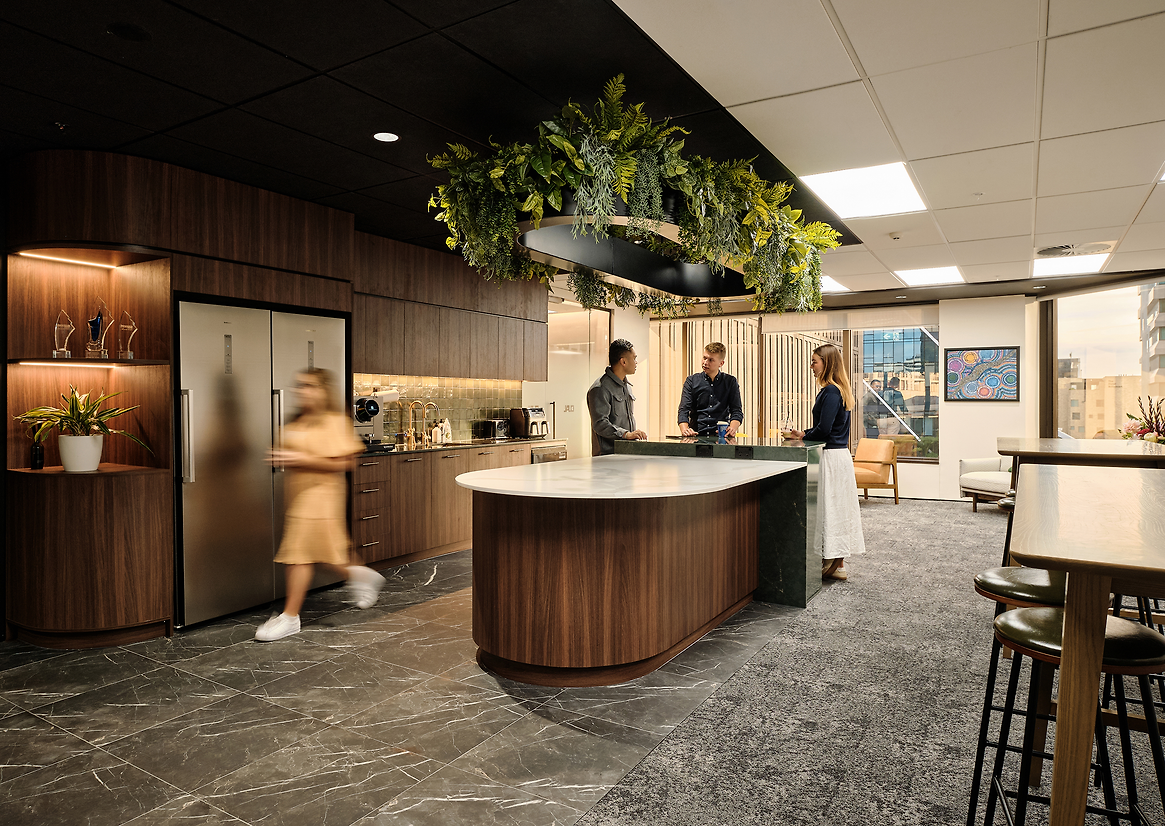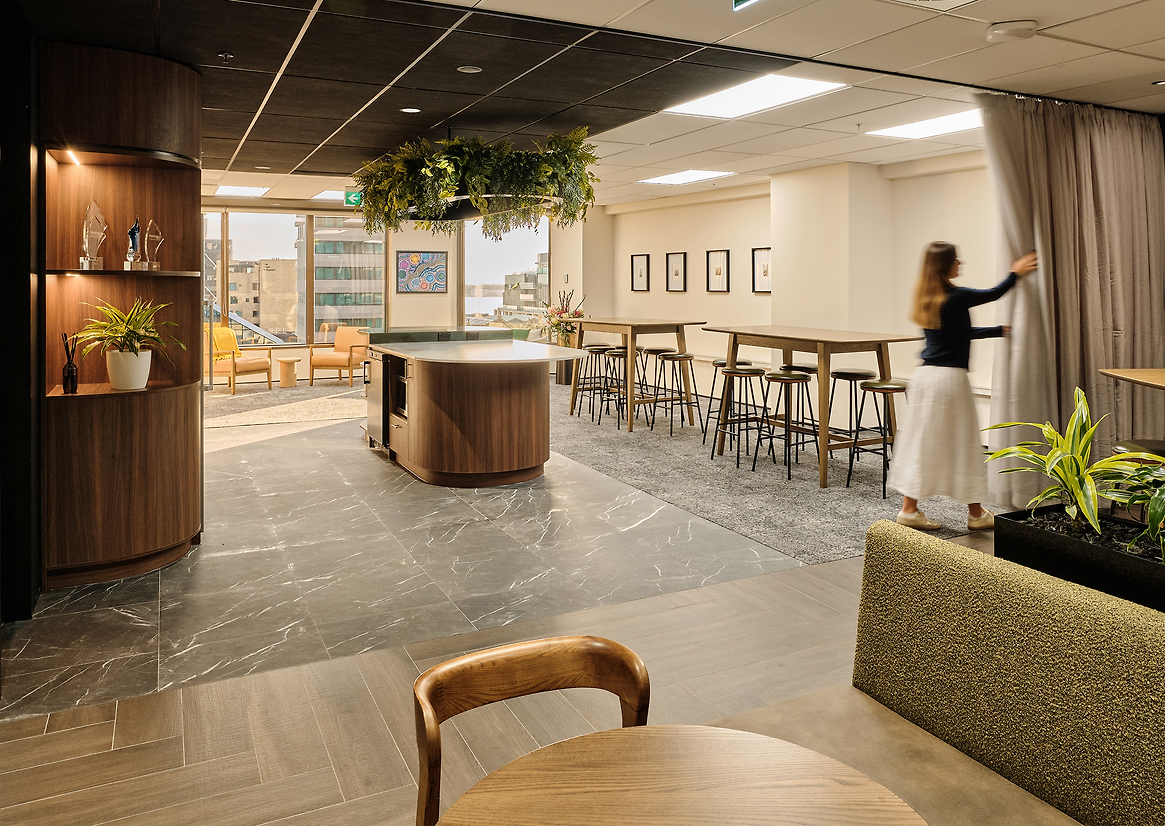 The events hub, seamlessly linked to the kitchen and entry, is framed by acoustic ceiling panels and a custom moss logo wall. Adaptable, branded, and ready for gathering.