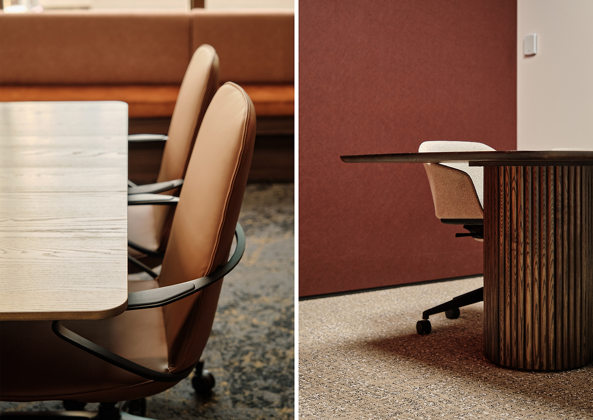 Environmental responsibility played a key role. The design retained 70% of the existing ceiling grid, and specified carbon-neutral acoustic tiles and recyclable carpet products showing that beauty, function and sustainability can align.