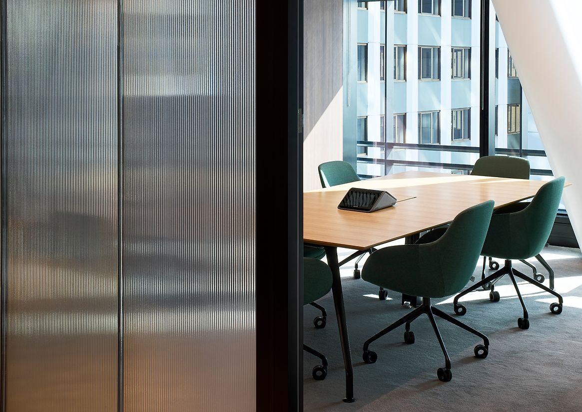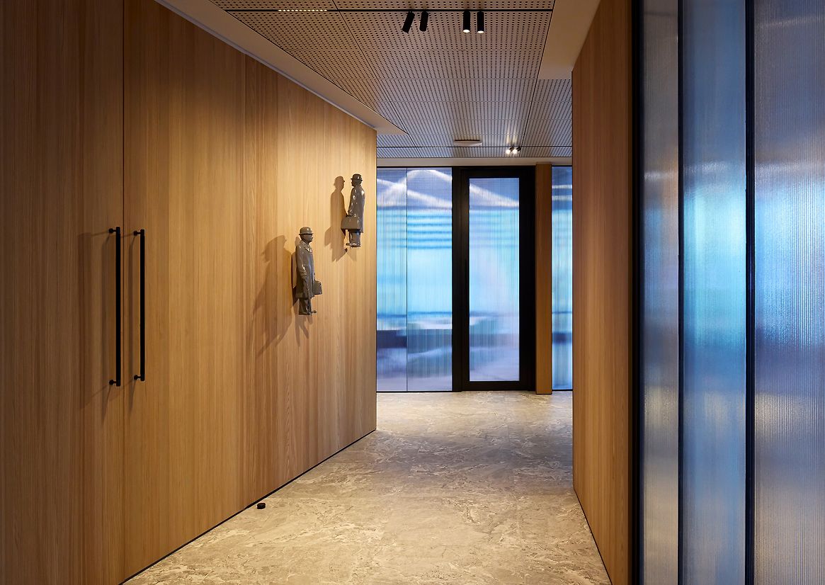 An elegant, highly textured workspace is created using warm timber veneers, fabric-lined wall panels, textured wallpapers, woollen broadloom carpets, bronzed mesh panels, and thoughtful furniture selections in a range of settings.