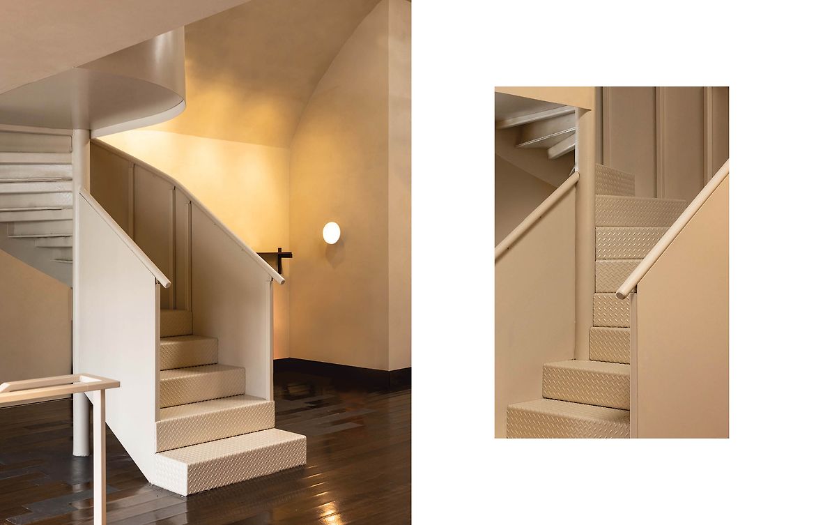 The office spans two levels, with a heroic spiral introduced to connect the lower & upper levels. The upper room informs a change in pace, shifting softly from the light-filled studio into an intimate cocoon deeper in tone - a rich carmine red. This change offers a sense of safety from which complicated & confidential discussions may become a little easier.
