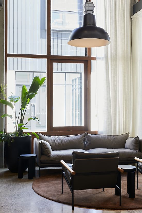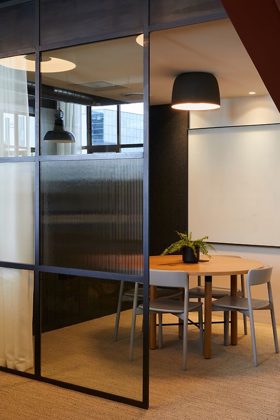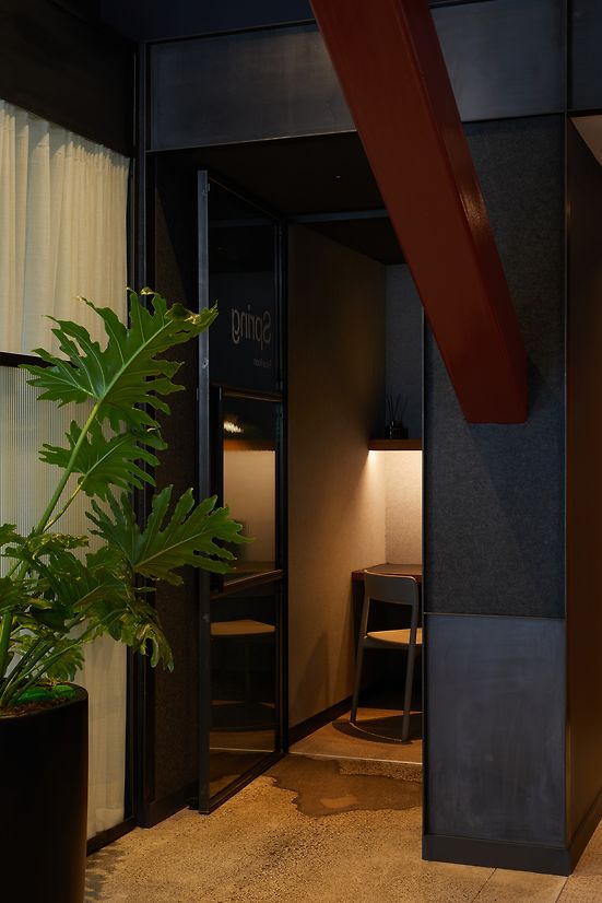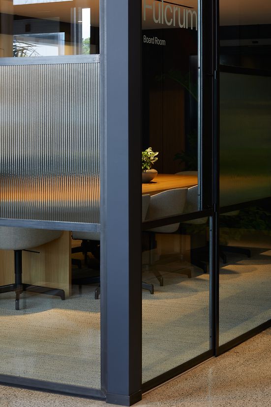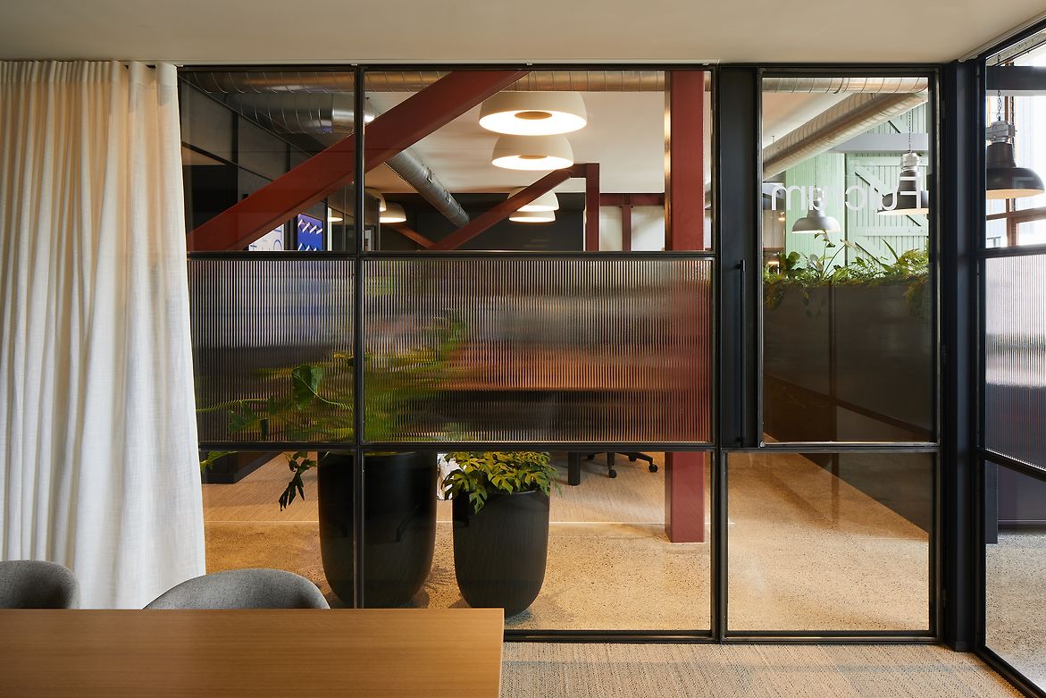 A layer of privacy is added by overlaying sheer curtains, patterned glass, and abundant planting. The curtains and planting were also part of the acoustic solution, along with acoustic wall panels applied in such a away as to not feel like we’ve lined the space in acoustic wall panels.
