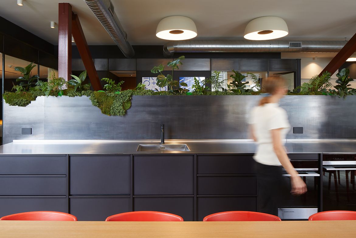 The tight floor area and large requirement meant an efficient layout was essential – a steel spine down the center of the space is the main organizing device – on one side, the staff kitchen and casual meeting areas that connect to the street – passers by don’t feel like they have an office full of workers staring at them, and the space looks like a café – achieving the goal of retaining the social connection to the neighbours.