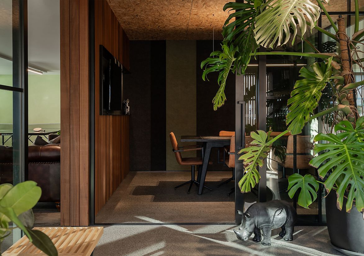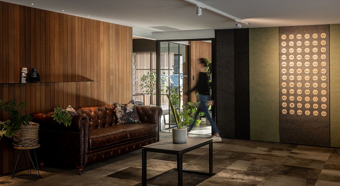 The studio’s interior utilised Floc panels made from 100% New Zealand wool, complemented by timber panelling and render, to enhance acoustic comfort and infuse the space with textural warmth. Soho aluminium glazed partitions offer a seamless balance, providing separation while maintaining privacy and visual connection.