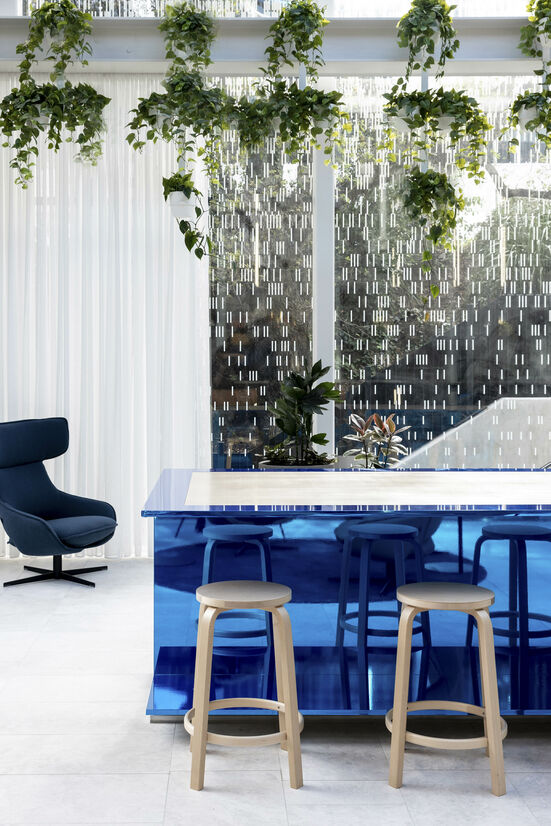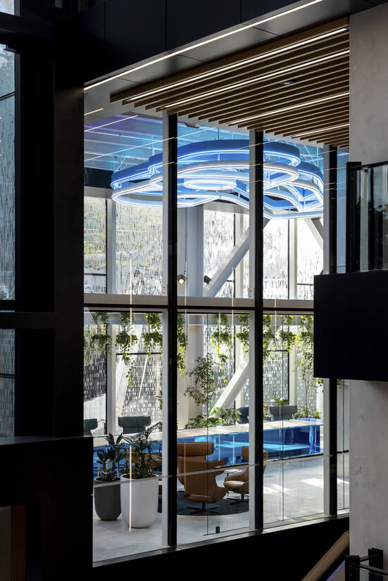 New Zealand’s first platinum WELL certification prioritises staff to be their best and therefore the best for their colleagues and customers. Authorship of space ensures the freedom of mobility and autonomy to craft and adapt the workspace to match the activities in each team’s neighbourhood. The adoption of scaffold-like framing and demountable whiteboards create workshops for agile collaboration allowing staff greater control and influence on their space. Showcasing activities that engage with the community are positioned front and centre to welcome guests with interactive screen technologies and oversized architecture like the balancing blue chrome metal ‘I’ beam and illuminated logo reminiscent of the bat-signal.
