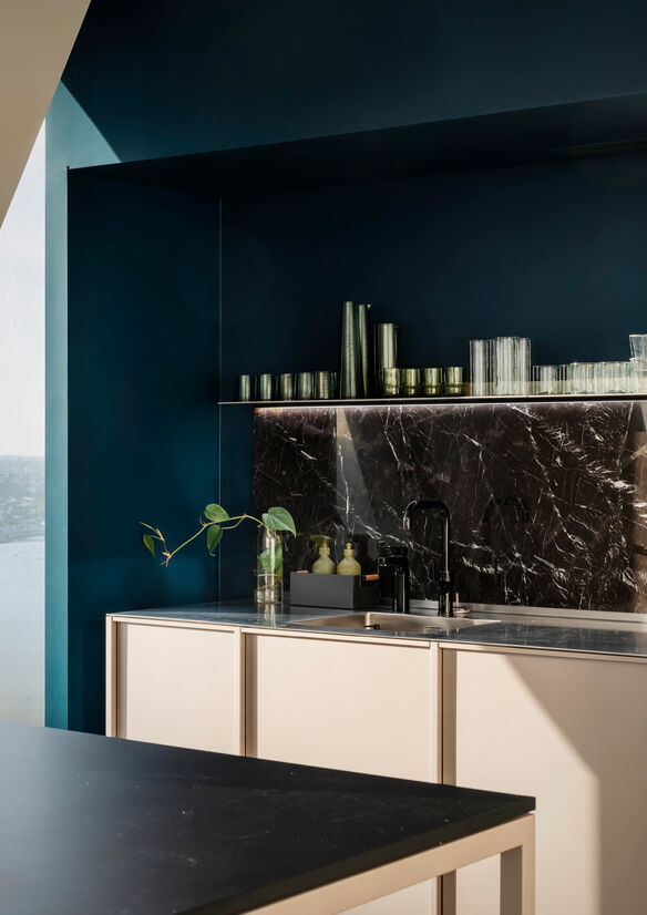 We wanted to create a unique experience of Aotearoa. Given the elevation and positioning of the suites in Commercial Bay, the original reference point for the design was native birds. Specifically, we referenced the Huia, an extinct species commonly found in the North Island. We were drawn to its subtle charisma and glossy black plumage with a green metallic sheen and long, white-tipped tail feathers. The use of gold metallics reference the distinctive bright orange wattles, the dark tones and patterning of the timber floor speaks of the feathers, while the use of silk wallpapers brings a hotel-style experience to the space. We specified New Zealand made and designed products where possible – IMO kitchens, Simon James pendants, Designer Rugs and Tim Webber furniture.