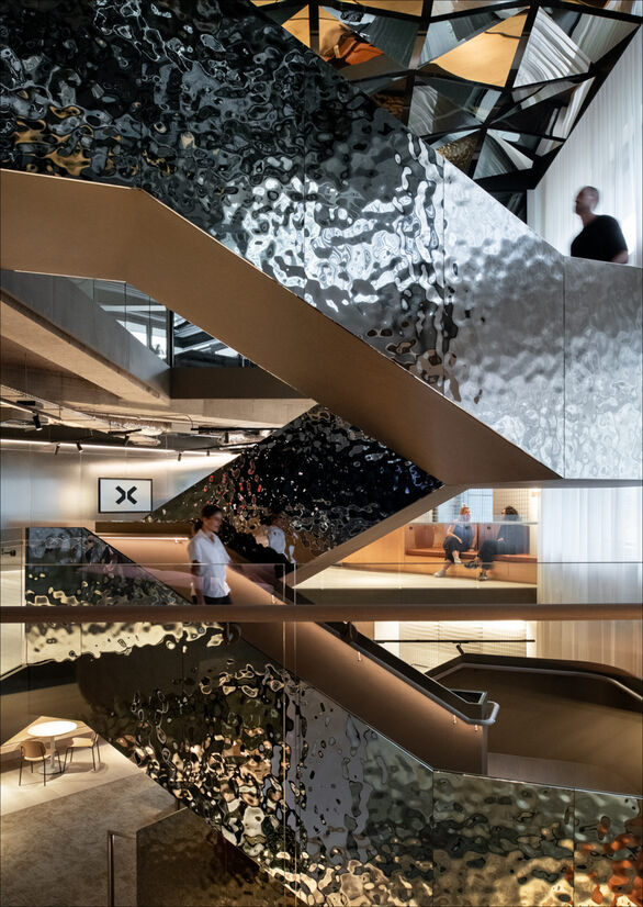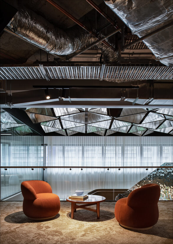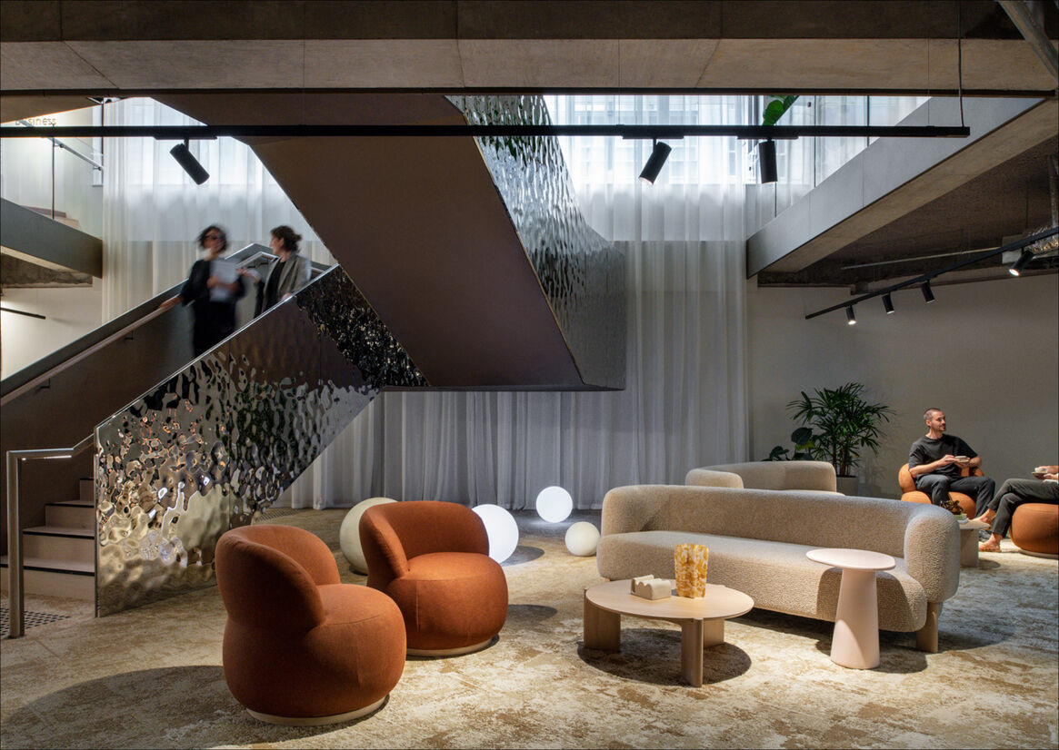 To address the limited natural light, a dramatic stair clad in ripple steel with a prismatic ceiling above and a three-storey drop of sheer curtains diffuses, reflects and refracts and amplifies light over the volume. The stair enables members to traverse from their suites on L5 and L7 through the community facilities on L6 which include social spaces, large seminar rooms, boardrooms, and general hosted experiences. Victorian Ash anchors the host space with copper-clad joinery and steel mesh to play with light further. A softer carpeted zone in the lounge connects to the sanctuary of an outdoor landscaped terrace.