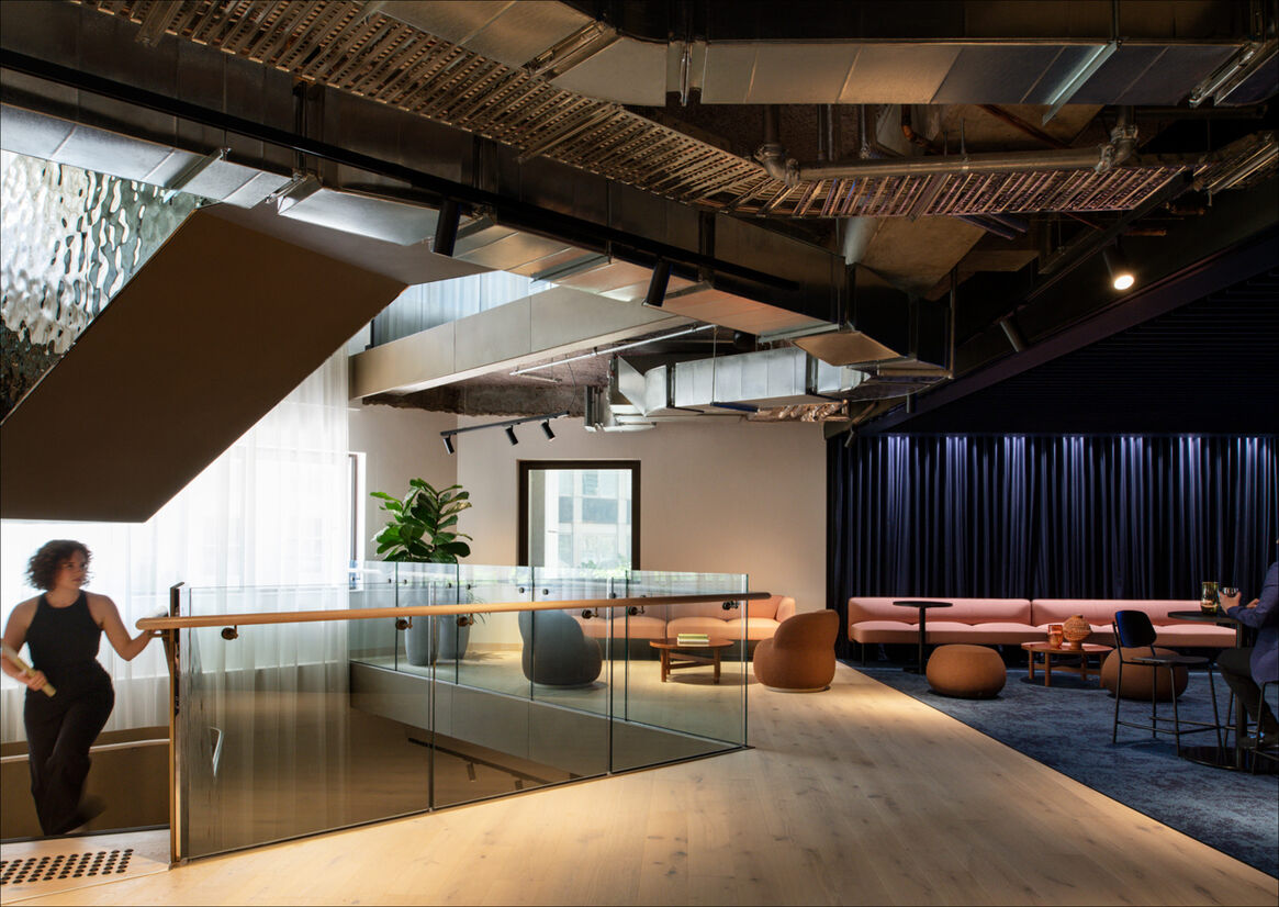 The facility must work very hard to achieve its revenue, it provides workspace for 240 members across 2680m2 and comprises 17 private suites, supported by six meeting rooms, five event spaces, terraces, and communal lounge zones. A blend of hard spaces (exposed and raw) and soft transitions (plush and colorful) bring drama and clearly defined destinations in the environment. The choice of materials is additive to these experiences.