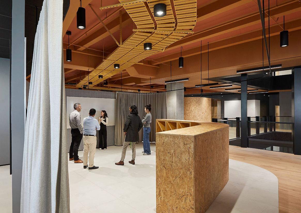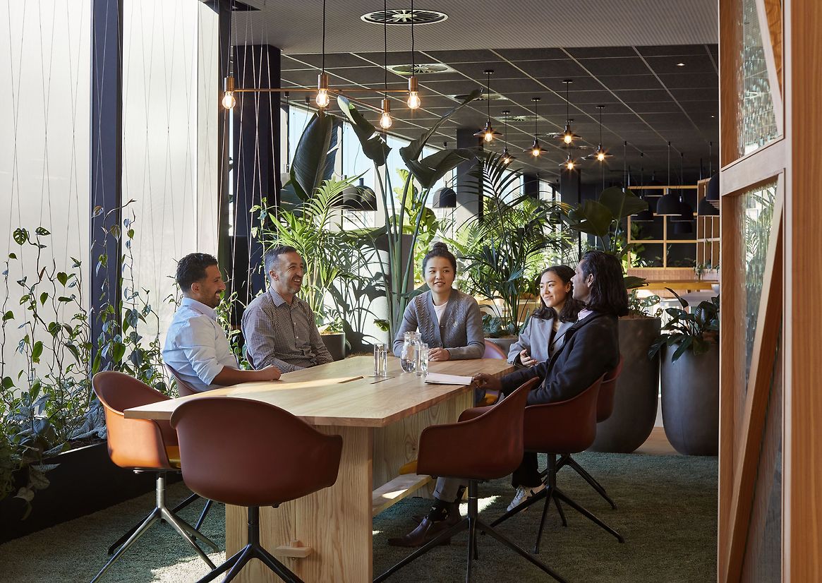 This workplace is located within a Greenstar 6 building, so the sustainability goals of the project focussed on reducing the climate change impact of the fitout, lowering embodied carbon by specifying timber structure and framing throughout and locally sourced products were preferred for joinery, acoustic finishes and selected furniture.