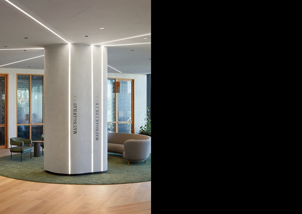 As a planning tool, curiosity was evoked by the creation of open collaboration spaces flowing around the central atrium and feature stair, inviting staff and visitors to interact while equally creating mystery with curved low height walls and curtains for privacy when needed. A meandering circulation path connects the entry and concierge with formal meeting rooms, the social café area, the innovation zone, the sanctuary space and the workspaces. The stair is positioned to maintain a view shaft through to the surrounding living Maunga and ancient Pā sites, which are highlighted by directional led lights around a central feature column in the front of house.