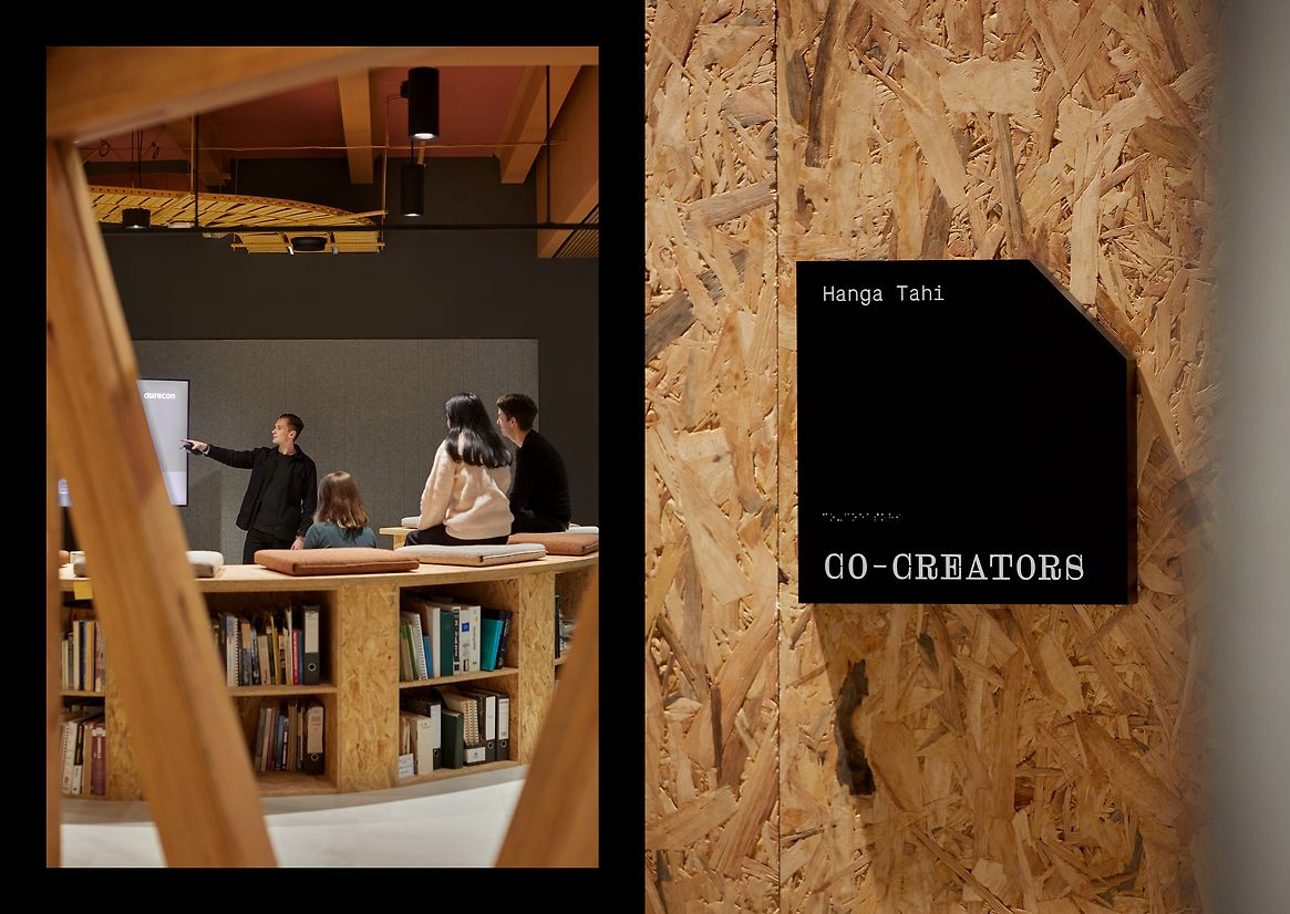 The materiality was inspired by the landscape and volcanic activity below Tāmaki Makaurau, with colours and forms replicating magma, lava, basalt, natural timber and obscure glass mimicking the obsidian formed when lava cools. Ancient super gardens are referenced with heavily planted areas, providing many spaces for respite within the workplace. Dark colours on the workspace ceilings create a safe space to escape from distractions, catering to those with diverse needs.