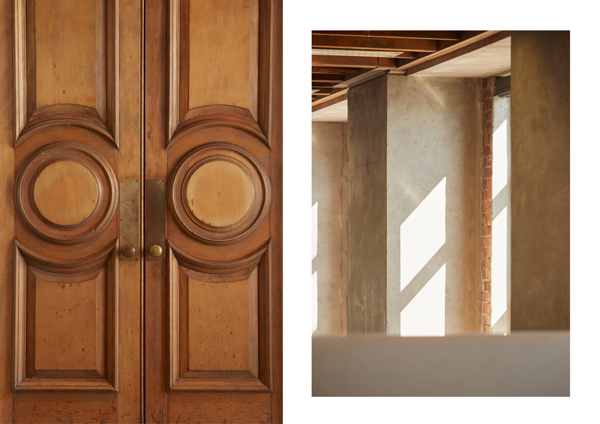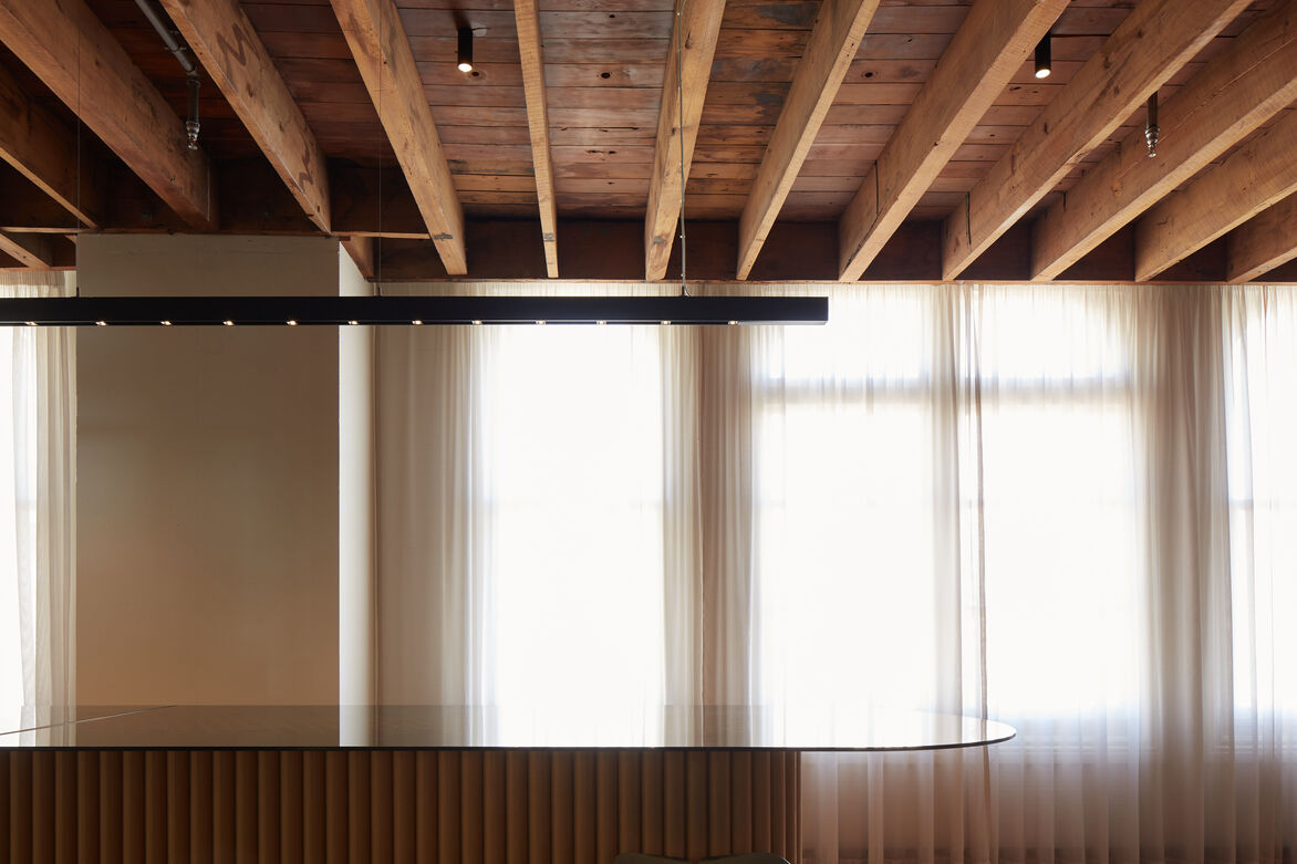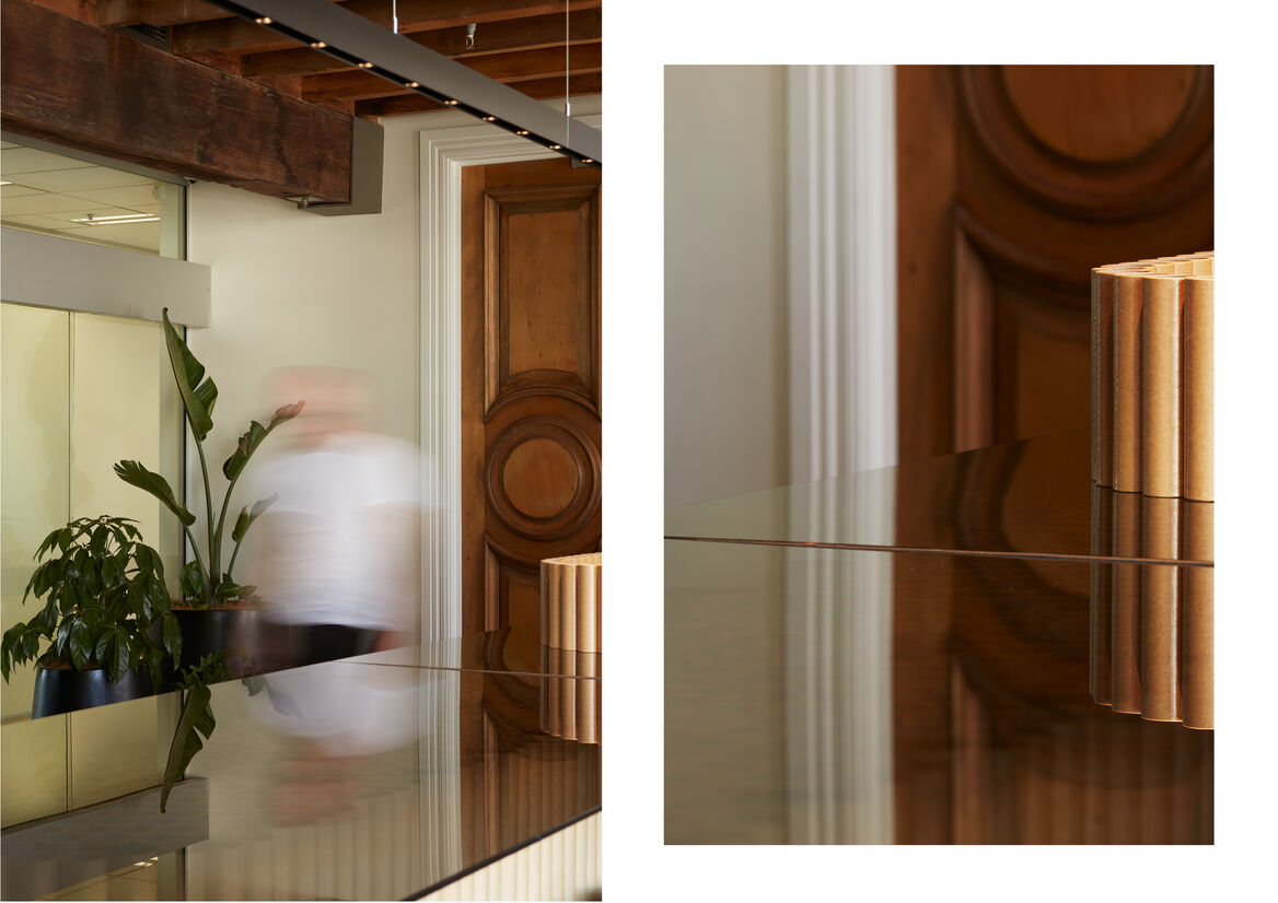 The reception counter was the major element of new joinery and was custom-made for the space, designed to reuse cardboard tubes in an unexpected way. The cardboard tubes and bronze-tinted glass provides a warm invitation and pays homage to the existing built fabric. The detailing is deceptively simple, appearing as only two elements - the robust cardboard tubes and the fine edge of the cantilevered glass top, with just enough visibility through to peak curiosity. ‘How the hell did they do that?’