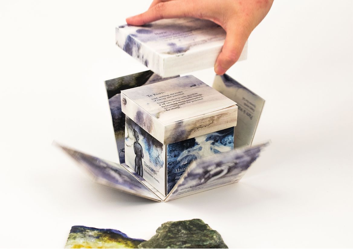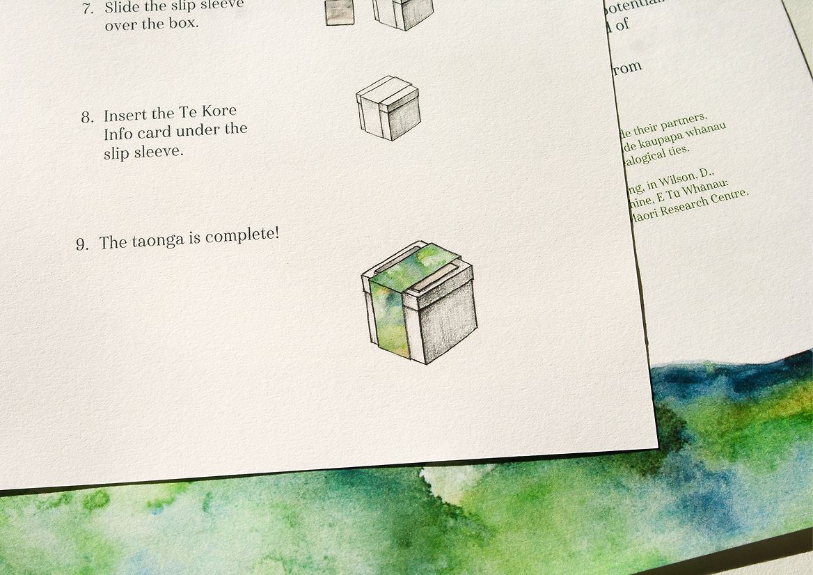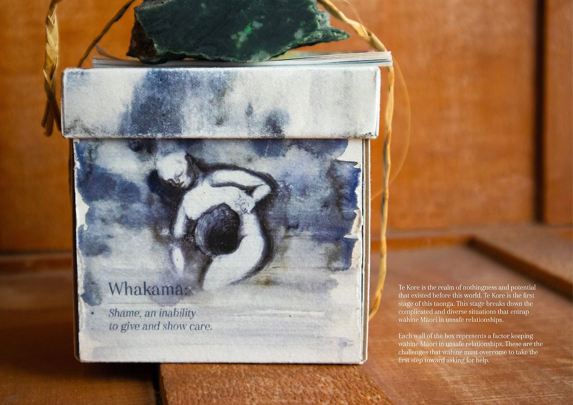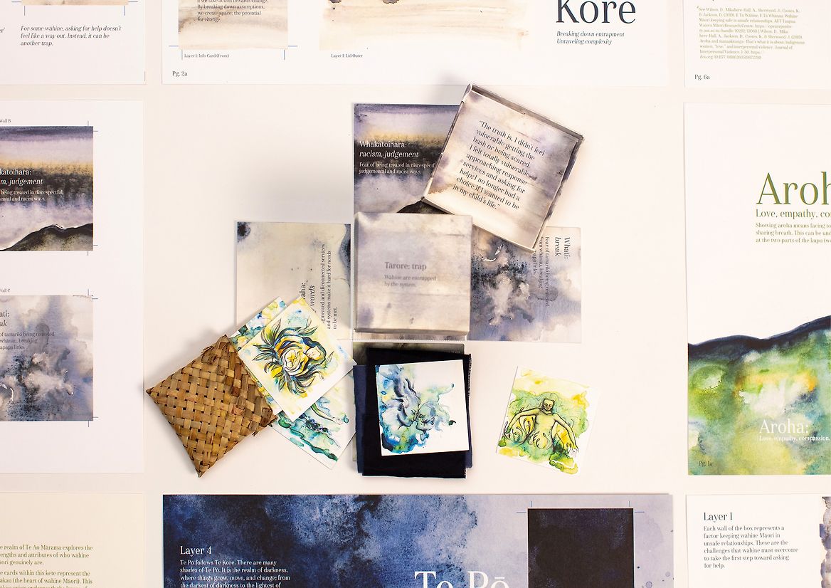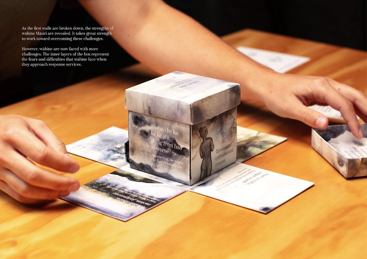The resource Bryre produced consists of layers: two illustrated ‘boxes’ and an inner kete. Each of these layers represents the different challenges that whānau Māori navigate as they approach services for support with whānau violence. At the centre of the layers, within the kete, are a series of cards which illustrate the inherent mana and tapu of wāhine Māori.