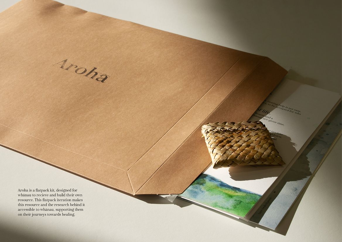 'Aroha' began as a storytelling resource that communicated the complex layers of whānau violence. It has been reimagined as a flat pack set that whānau and kaimahi can build for themselves to use as a learning tool and healing taonga.