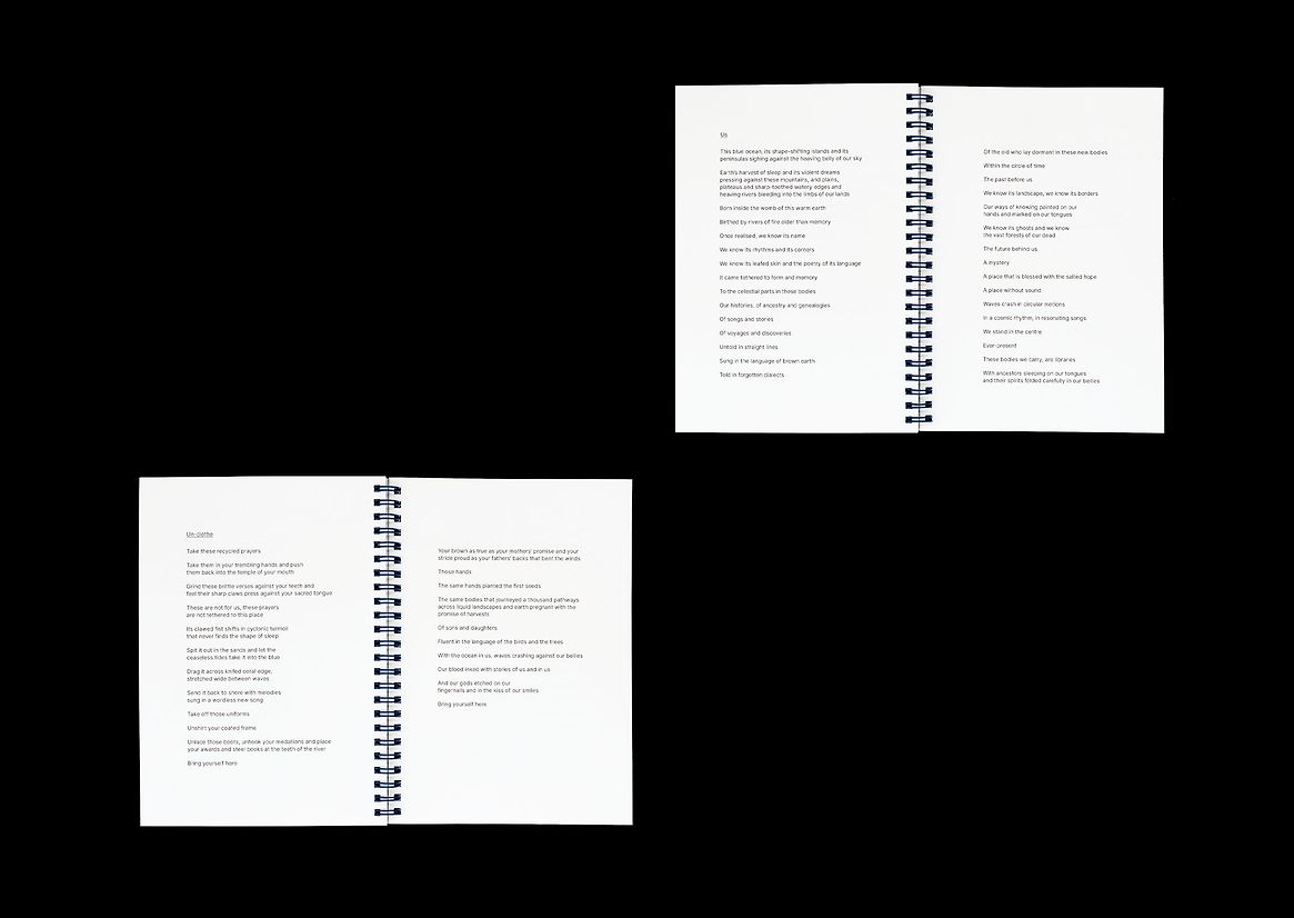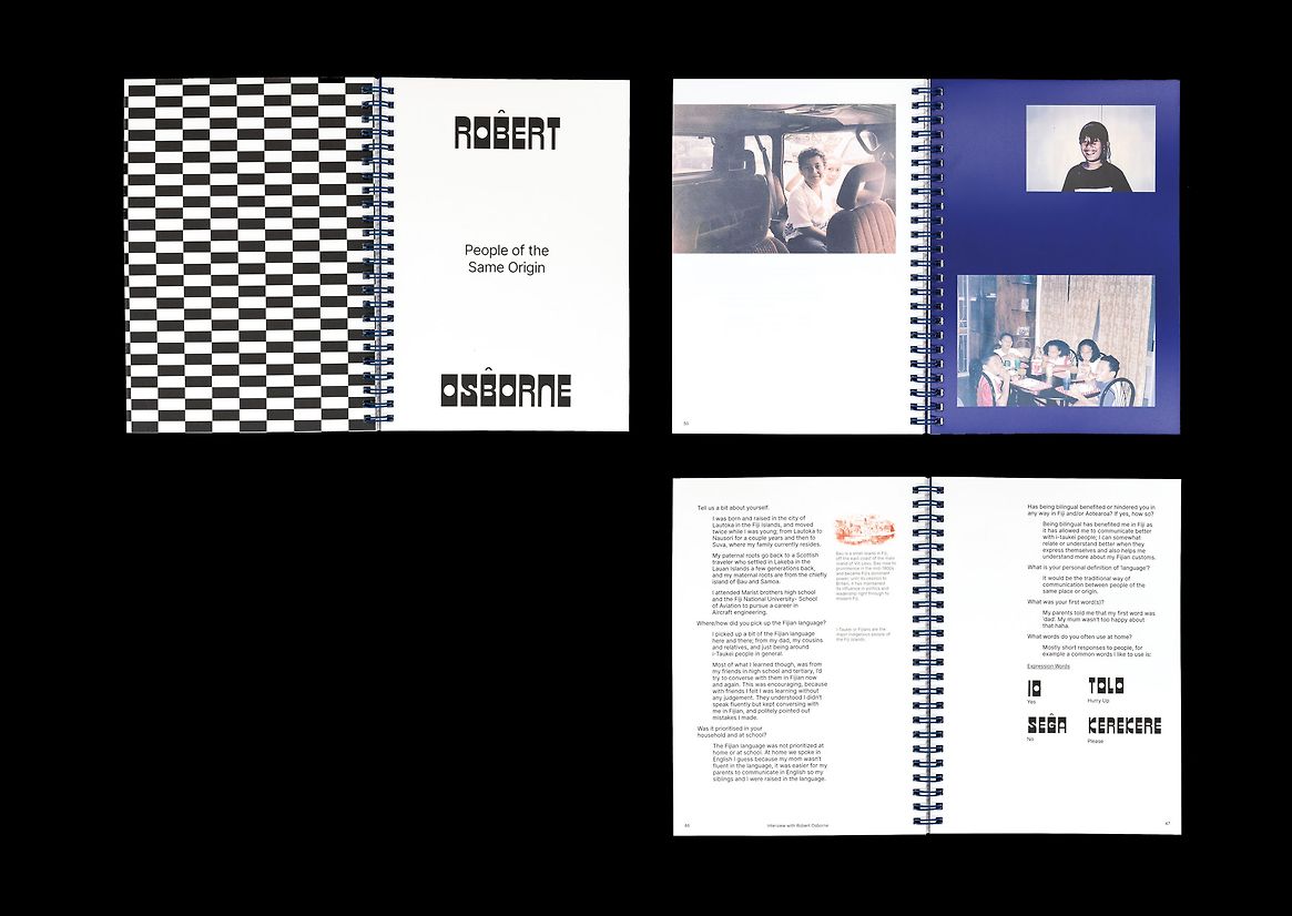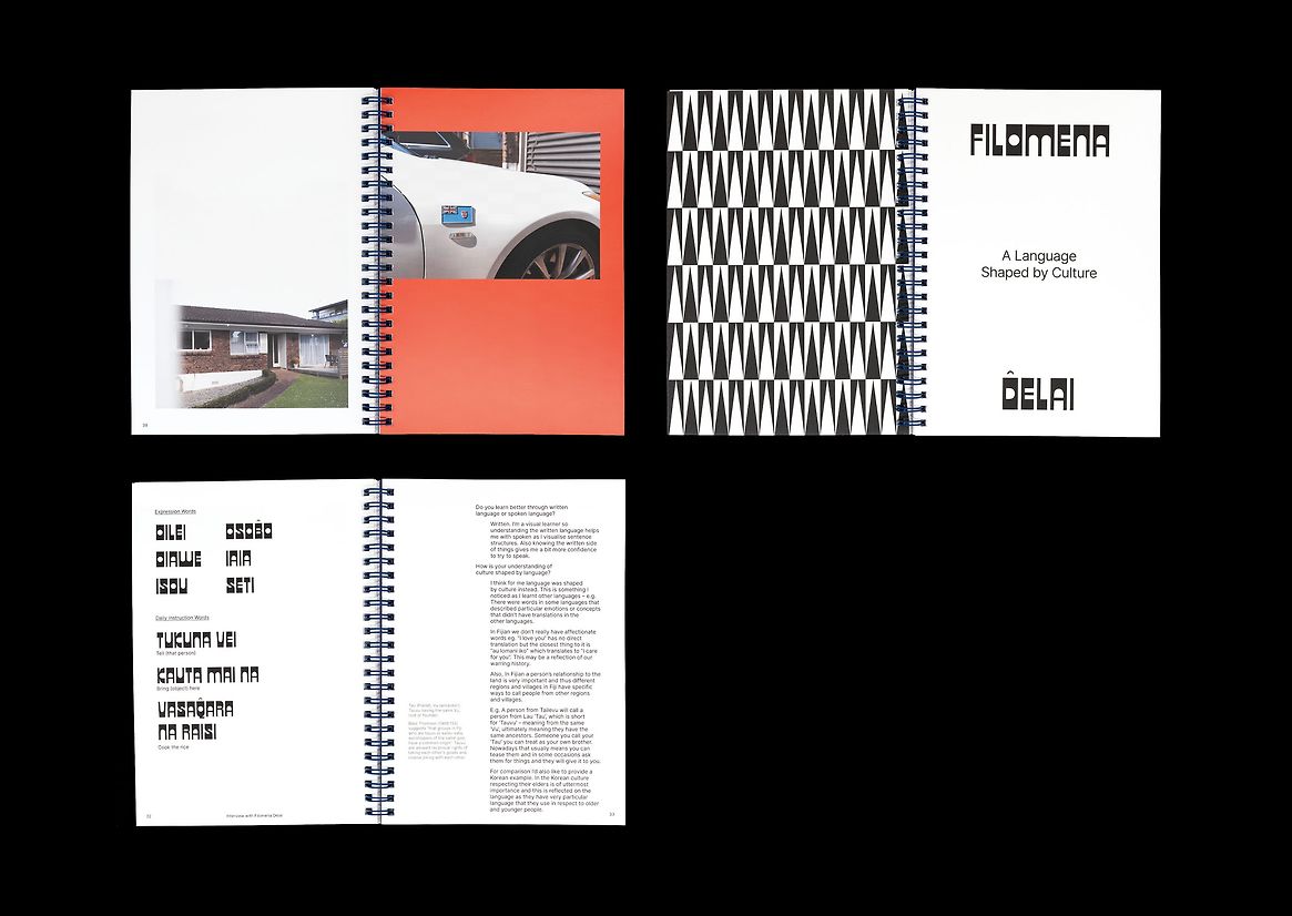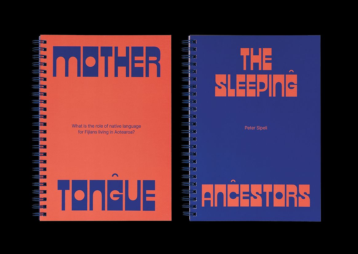 Most of Fiji’s diverse citizens communicate in their native tongue at home, whether in a Fijian dialect, Hindi or other languages. Despite this, English is the most commonly used language across most of Fiji’s media and is prioritised in classrooms. Born and raised in Fiji by a Samoan mother and a Fijian father, English was the language that we spoke at home. It wasn’t until I moved to Aotearoa that my knowledge gap in the native language had become apparent to me. There was irony in the fact that it took moving away from my country to realise how disconnected I was from my culture. ‘Mother Tongue’ became a personal inquiry as I sought to explore the role of language in the lives of Fijians living in Aotearoa. Through the research method of ‘talanoa’, ‘Mother Tongue’ investigates whether there is context lost in the translation from the Fijian language to English, starting with words that have no direct translation. The book starts by highlighting the lives of Fijian language-speaking migrants in Aotearoa to learn about their experiences navigating a diasporic landscape. We journey through their upbringing, from childhood to adulthood, before and after migrating to Aotearoa. The interviewees were able to form responses to words and provide context to phrases in the way that they felt most comfortable doing so, including but not limited to, artistic expressions. Design decisions were guided through a number of historical themes and traditional practices to communicate delicate stories and experiences whilst uplifting the mana of those who were sharing. The hero typeface was inspired by the landscape of Fiji at the period of time in which Fiji intersected with the Westernised world. Buildings around Fiji’s current capital, Suva, reflected a pattern of squared corners and edges with a contradicting roundness. The sharp outside edges and rounded inside arches gave off a look of both robustness and amiability. These conflicting characteristics from my own experience were seen as an unintentional reference to the Fijian culture and its people, who are fierce but also the most hospitable people. To help readers who are new to the Fijian language or are on the journey of learning the language, a design element was created to go above the special characters that have a different pronunciation than that of the English pronunciation. This design element is a subtle reminder that the character is pronounced differently in the Fijian language. With the budding growth of the Fijian community here in Aotearoa, ‘Mother Tongue’ revealed the intentions of the Fijian youth in New Zealand and their eagerness to learn and continue practising Fijian cultural practices and language. ‘Mother Tongue’ became a safe space for me not just to learn, but to connect with Fijians in my community, in a country far from home. In return, I hope that it too brings a sense of comfort to Fijians in Aotearoa, helping them to relate with one another regardless of where they may be on their journey of learning and unlearning.