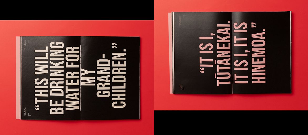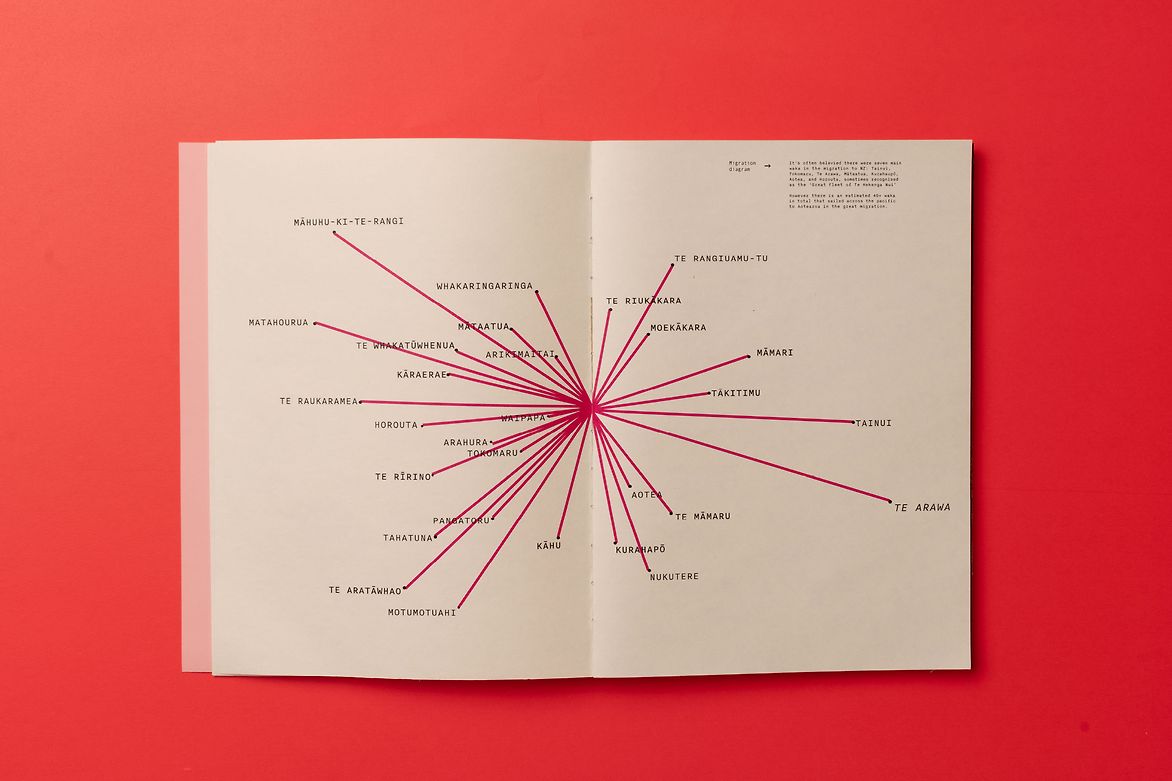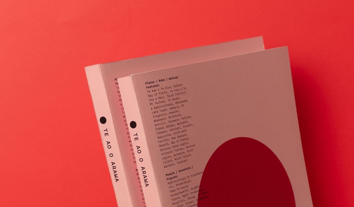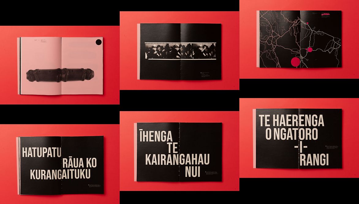 Structured across a main book, glossary booklet, and fold-out whakapapa poster, the design draws on Māori worldviews such as ka mua, ka muri (walking backwards into the future) and the porowhita (circle), symbolising the interconnectedness of time, people, and place. Circular motifs and soft pink tones reinterpret traditional symbolism, red as a marker of whakapapa and sacredness, through a contemporary lens.