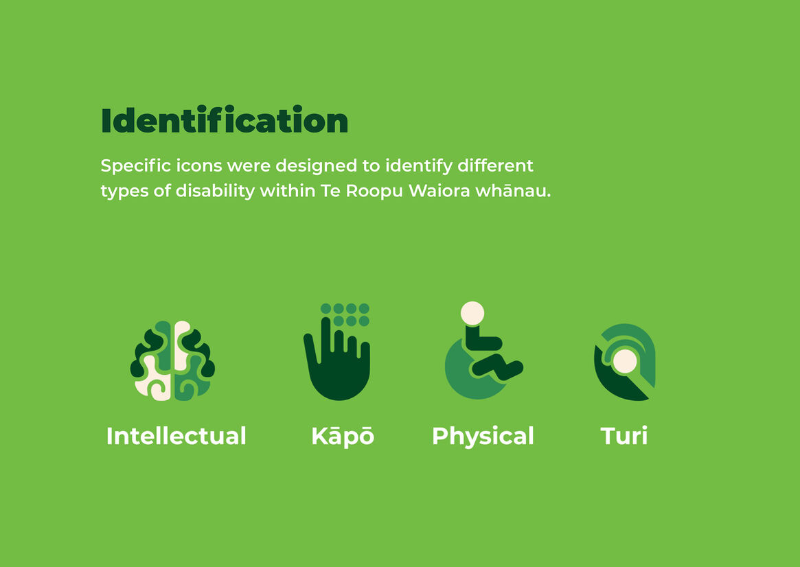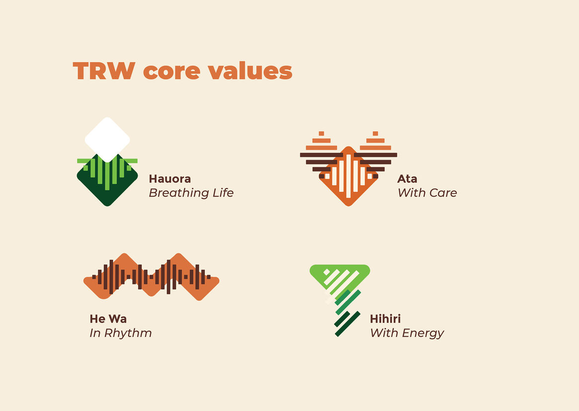 Colour palette reflected Māori cultural and historical significance. We used shades of green to communicate and resemble nature's qualities and connect the koru logo motifs with approachability, resilience, health, and trust. The design also included shades of orange and brown to encourage a sense of action, stability, strength, creativity, and warmth that are intrinsic qualities of TRW. The use of these colours within Te Ao Māori derives from natural resources like pounamu (jade greenstone) and Kokowai (ochre pigment) to decorate waka and Marae. Using TRW four core values, we generated visual language composed of graphic elements inspired by 'Raranga,' the traditional Māori practice of flax weaving. The idea of weaving/ intertwining inspired the designed icons, and it represents these values as it gives a sense of connection to TRW.