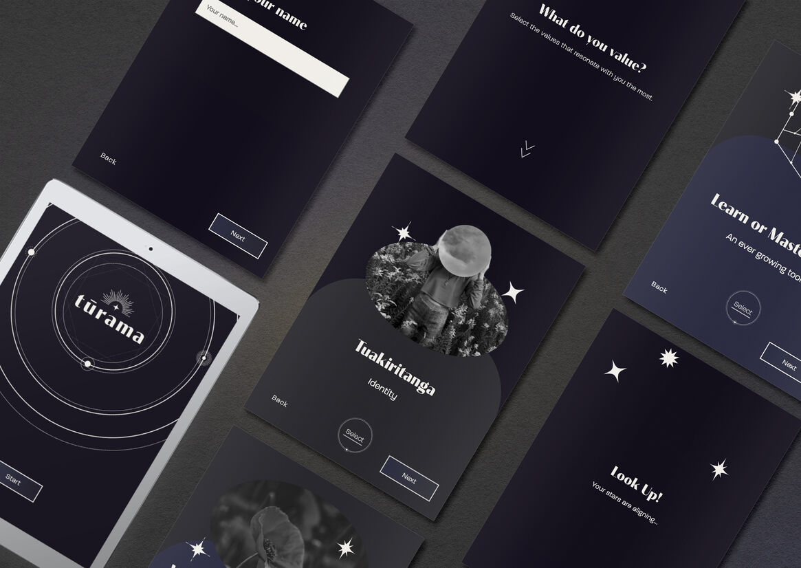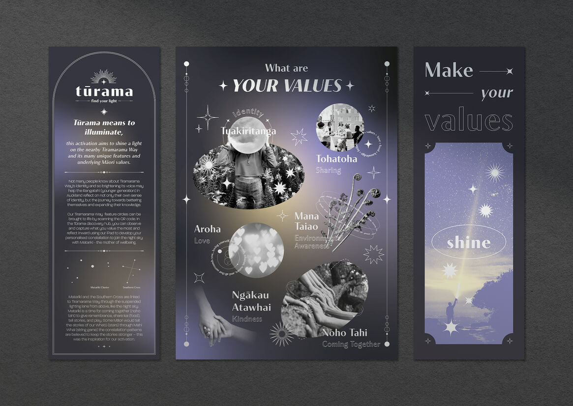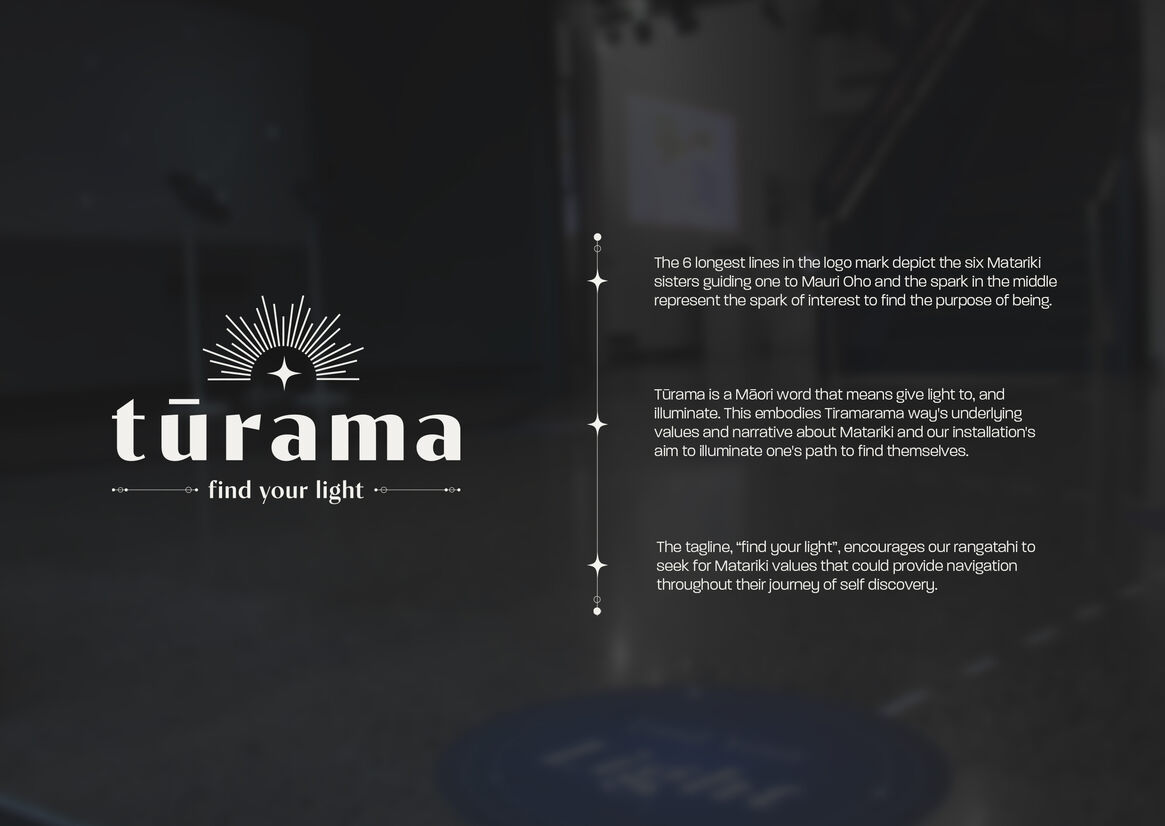 Tūrama means beacon of light, standing strong in its own right. It is a journey to illuminating what shapes our rangatahi’s personal sense of self, through the reflection of Mātauranga Māori values and unique features that surround us during 2022’s special Matariki celebrations. The rangatahi in Tāmaki makaurau struggle with finding their sense of self and purpose, The upcoming Matariki celebrations provide the opportunity for self-reflection and growth. Young adults in a post-pandemic world are also seeking environments and communities where they can feel accepted for who they are. The Tūrama experience of 2022 activates the space of Tīramarama Way through its three-part journey of Exploration, Connection and Reflection. Starting with an accessible Instagram AR filter, Rangatahi can scan featured photographs or visuals to reveal a 3D ‘window’ to interact with Māori values relative to the location. The wayfinding from these posters will then lead the user to the discovery hub where they can connect more visually with these values, they can then reflect inward via our constellation creation interface by applying their nickname, date of birth, core values and aspirations to create their own projected personalised constellation in front of them. Their constellation will allow a moment of viewing before the next steps of becoming a part of a night sky with others' own constellations.