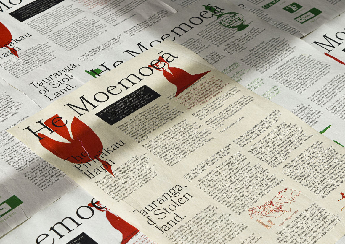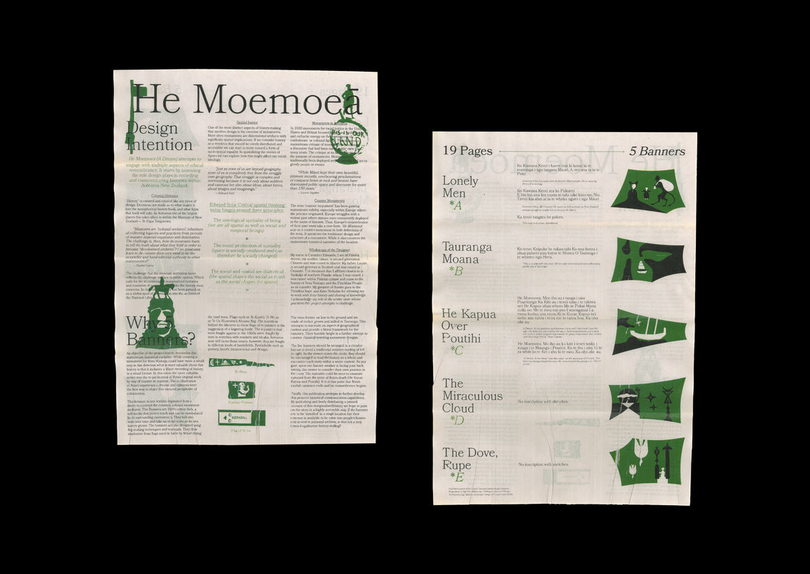 He Moemoeā reaches back almost 200 years to the early colonial period of Aotearoa. It is a translation and re-publishing of Aporos sketches. These sketches intimately record a Māori experience resisting Pākehā forces and have subsequently been marginalised by mainstream colonial historical knowledge. He Moemoeā sits as a counter-monument within our current colonial landscape. It attempts to critique traditional remembrance practices while acting as a case study for design translation.