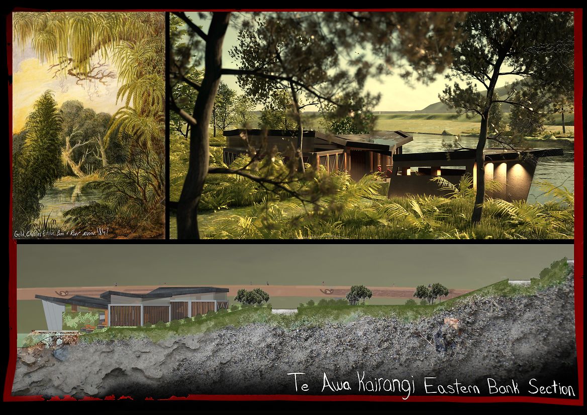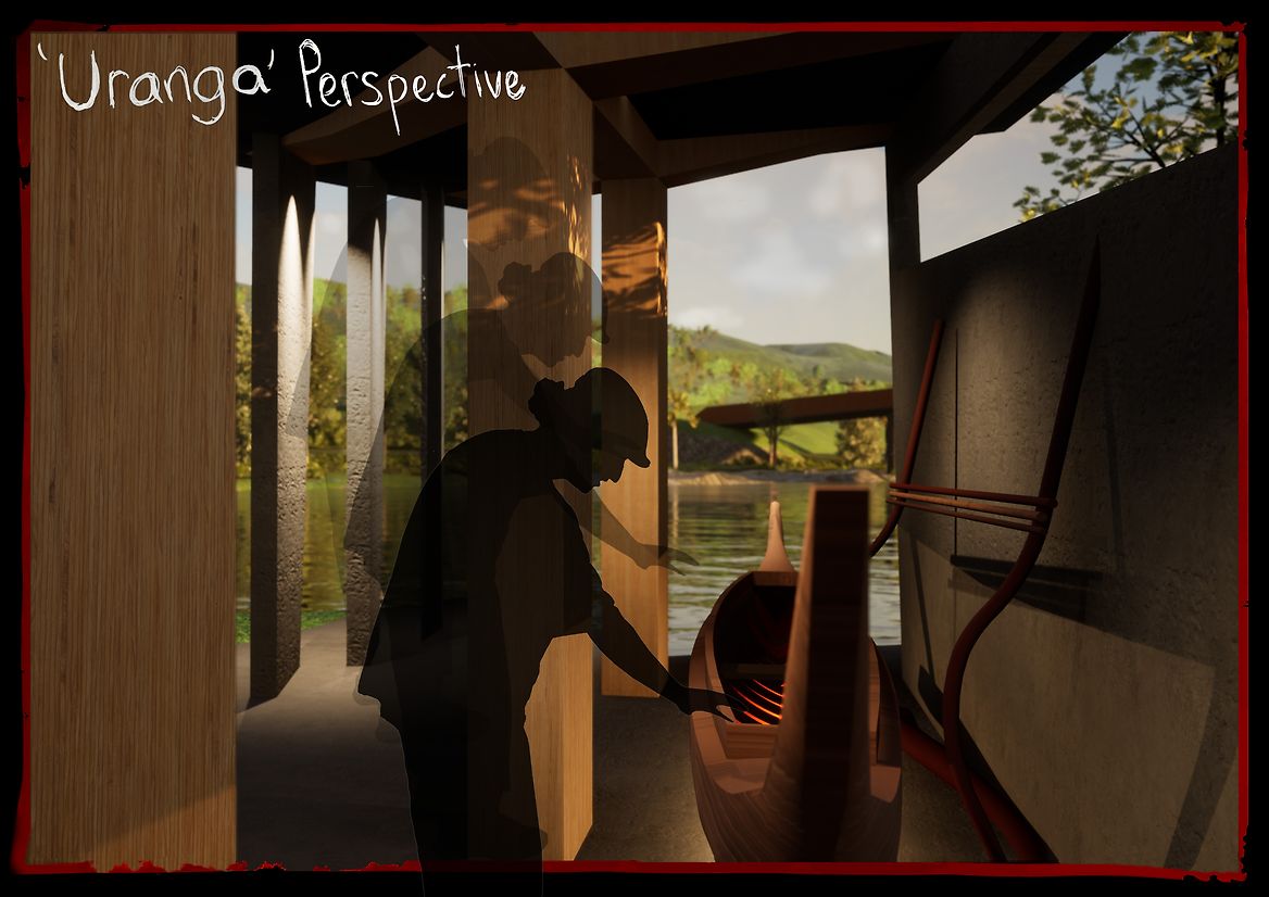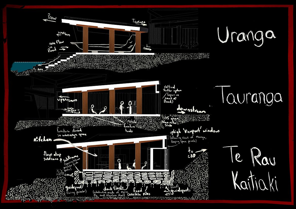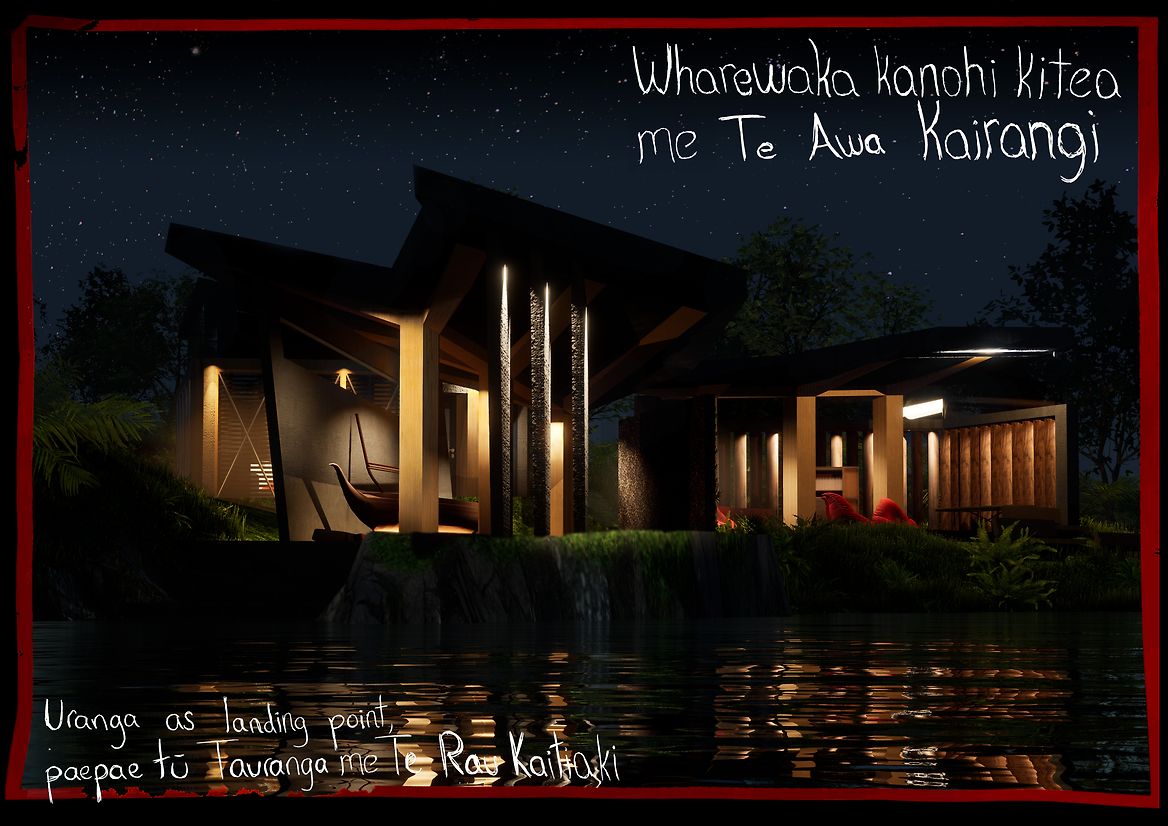 The physical structure of Kātao o te maunga, Hōkio ki te tai will inevitably spend moments of its life underwater, a result of Te Awa Kairangi calling for the return of her desired course, and the removal of her humanly determined one. In response, this proposed design is built to be flooded, to be of no hindrance to the awa once she takes her course. Some may consider this a speculative future; this is our reality. What if we upheld the mauri of Te Awa Kairangi, embracing her chosen course? Aro mai tātou te whakapapa o te awa...? 'whakahuahua i ngā hikuawa o Te Awa Kairangi'