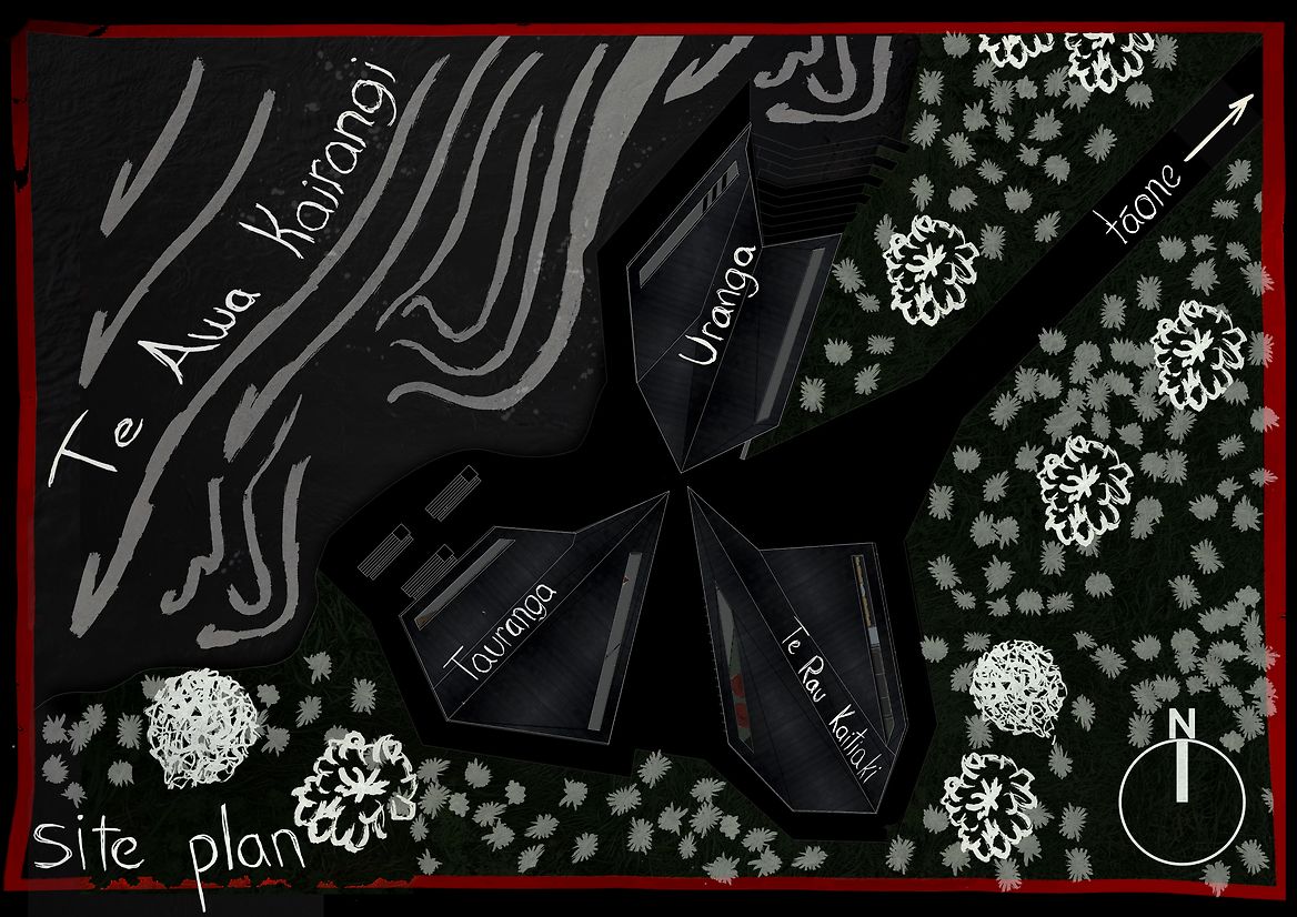 Three folded planes, each resembling a single hēra of the great voyaging waka forms the layout of Kātao o te maunga, Hōkio ki te tai. These hēra stand proud amongst the chiselled chasm that is now the destined flow of Te Awa Kairangi. The three planes taitapa (frame) the differing identities of the spaces, connected on the papa whenua (ground floor) to tautoko (support) the core kaupapa (approach) that is to echo values of kaitiakitanga through our spaces. The three planes, named Ūranga, Tauranga and Te Rau Kaitiaki form pavilions, tied together through their kindred design detailing and shaped papa whenua, harmonising with the whenua below. The grounding plane continually calls out to the whakapapa of the space via outfacing apertures, taitapa e karanga whakakpapa ō te awa – the framings call out to the whakapapa of the river.