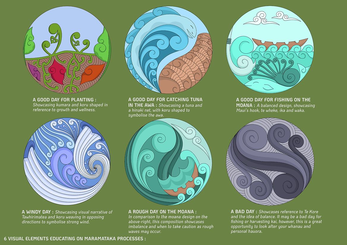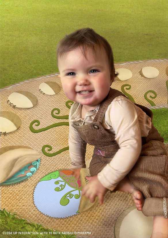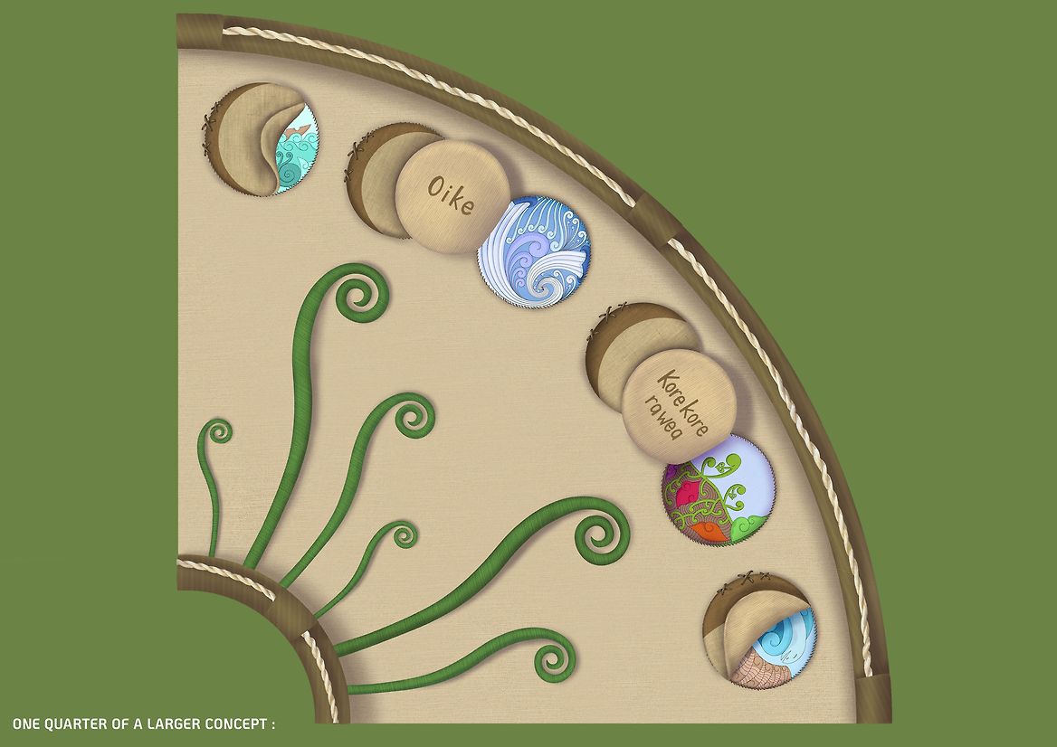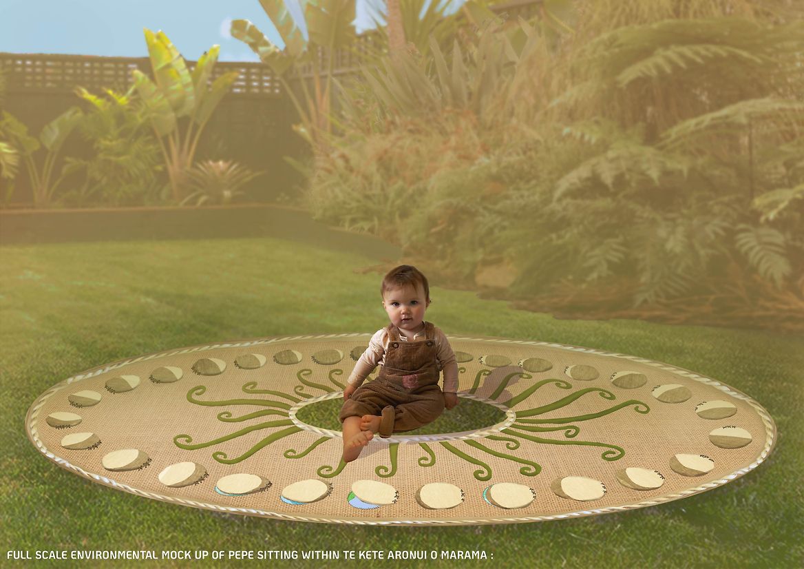 This concept is a physically interactive outdoor floor mat encompassing mātauranga surrounding Māramataka. It was created to enable relationship-building between parents and children through physical engagement with Māori materials. Most importantly, it aims to encourage tamariki to embrace their Māoritanga so they can grow up with an indigenously-grounded worldview and harness the knowledge that is their birthright. The mātauranga within Māramataka helps us understand the importance of kaitiakitanga, prioritising our hauora and whanau relationships, and works as an enabling educational tool.