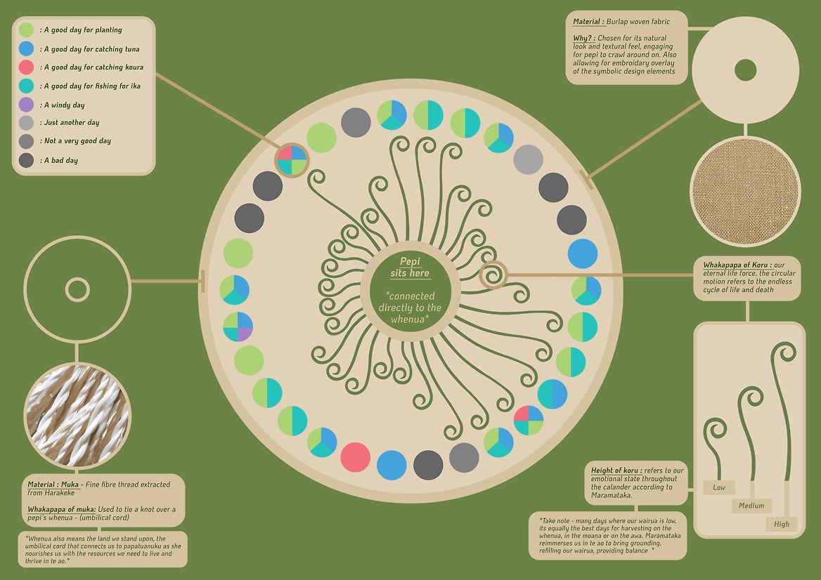 ‘Ko te kete aronui o marama’ aims to respond to the needs of Indigenous Māori learners. It is created to enable curiosity, imagination and explorative thinking. It breaks all the confinements of what we see as education and combines it with play, making the process and idea of education associated with joy. It responds to the idea that learning shouldn’t be done in isolation but instead as whanau-centric, that learning, play and whanau time can be valued harmoniously. This concept explores functionality in multiple aspects, including the lift-up tab components harnessing the physical phase of the moon, te reo names for the day's Mārama phase and, on the base of the mat, a visual design of the harvesting practice for the day. The differing lengths of koru symbolise our high, medium and low energy states, showing when it's important to focus on your own and your whanau hauora. The transformation into this shape reinforces the concept's name, as its change in shape and function showcases the mātauranga within the mat regarding Māramataka being kept safe in te kete aronui, creating a culturally safe kete of knowledge for tamariki to absorb.