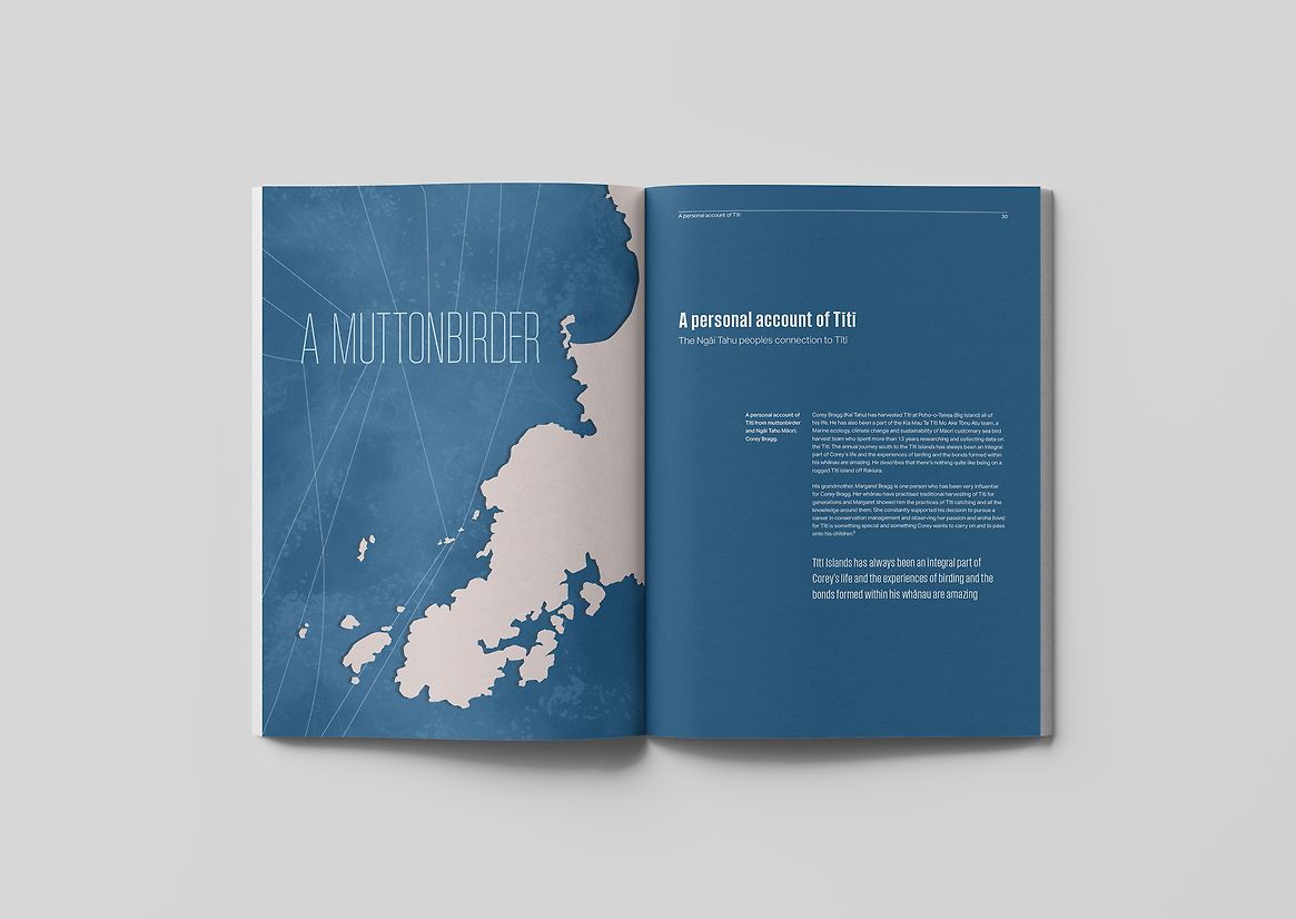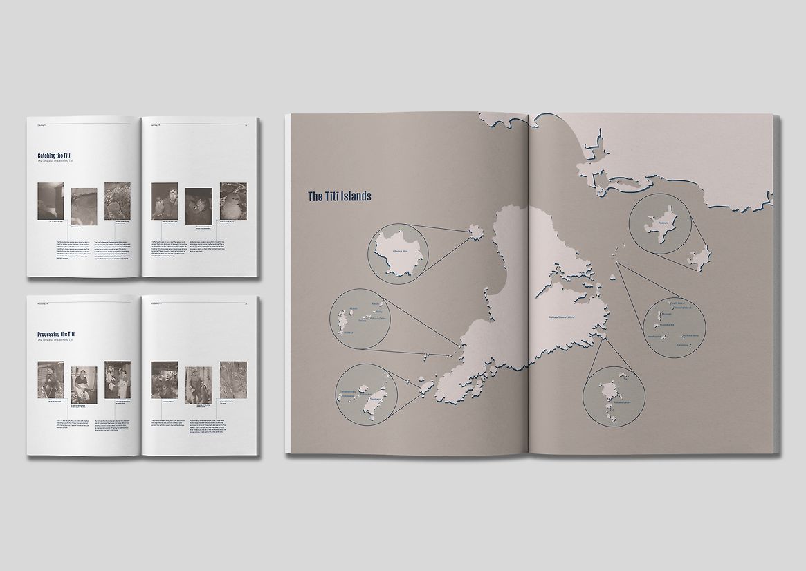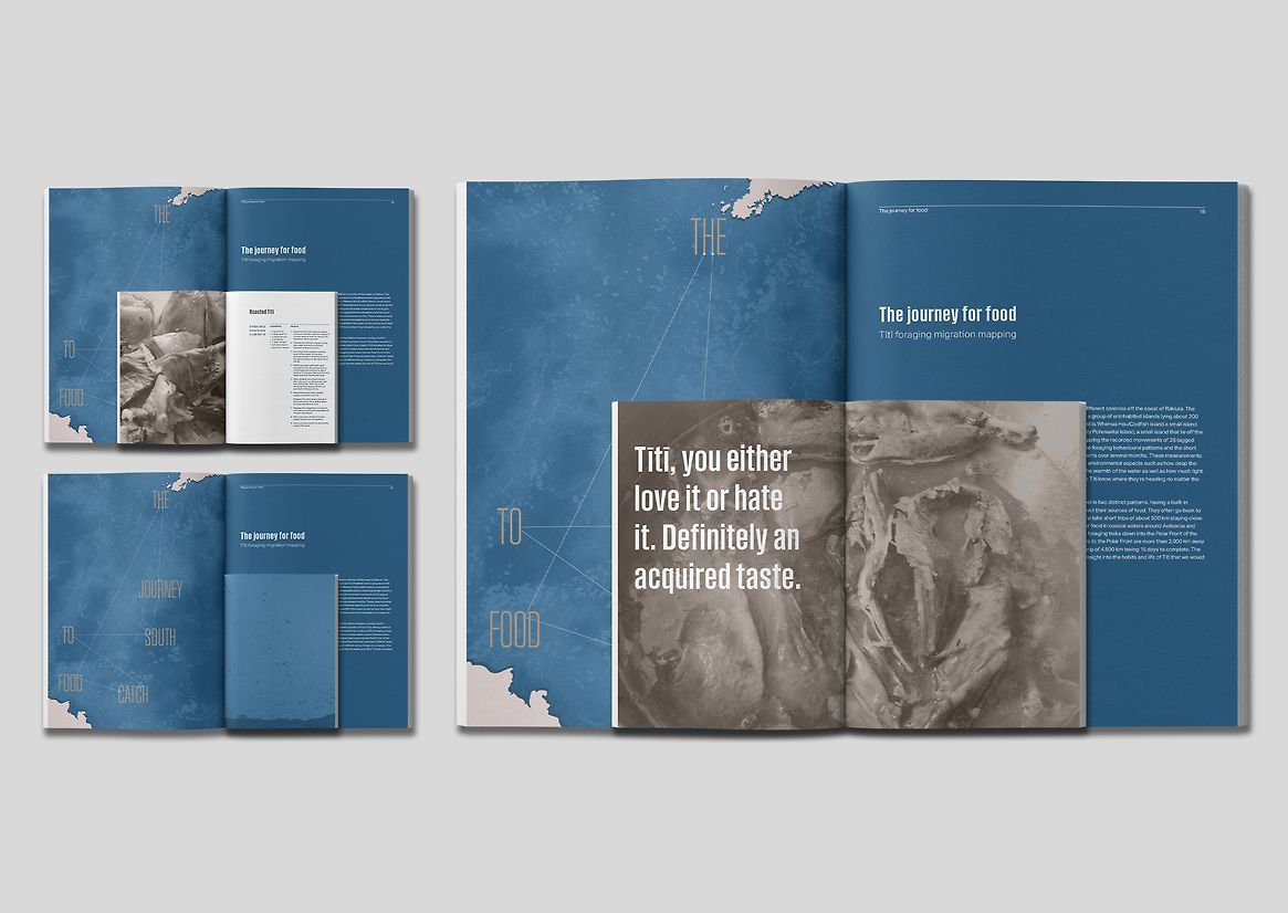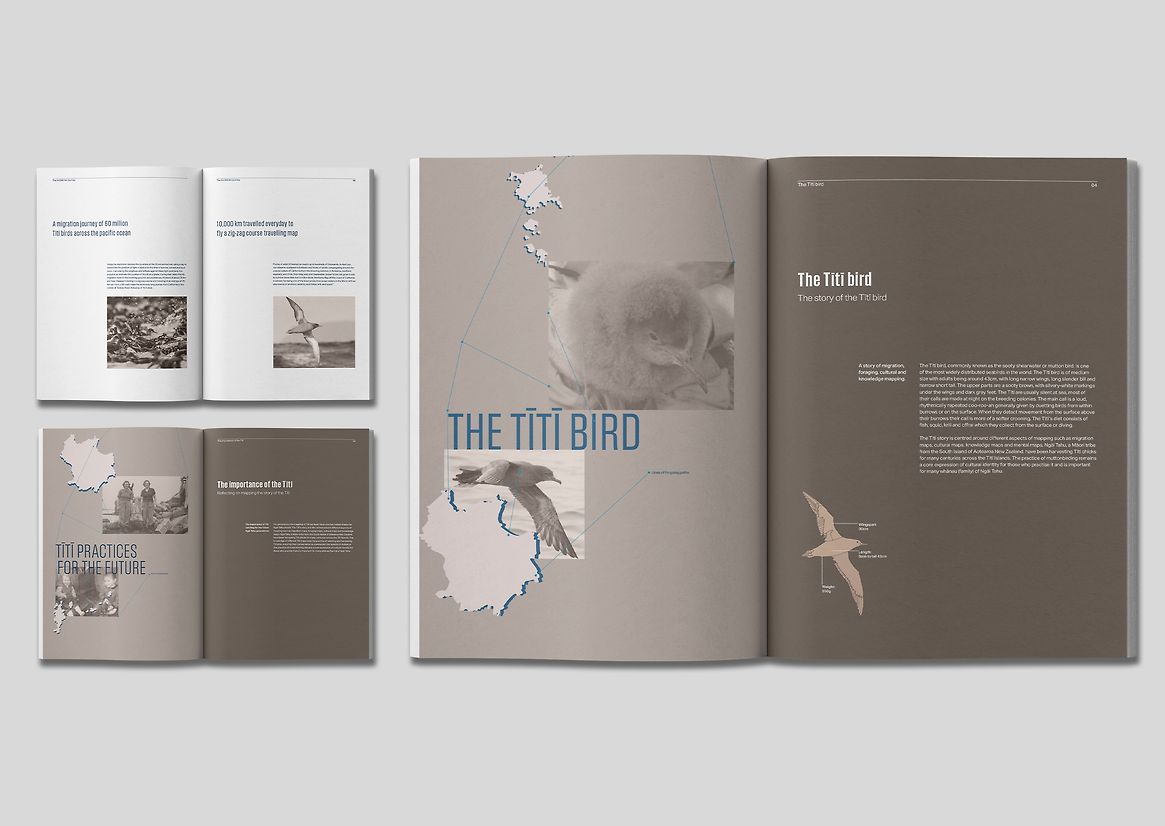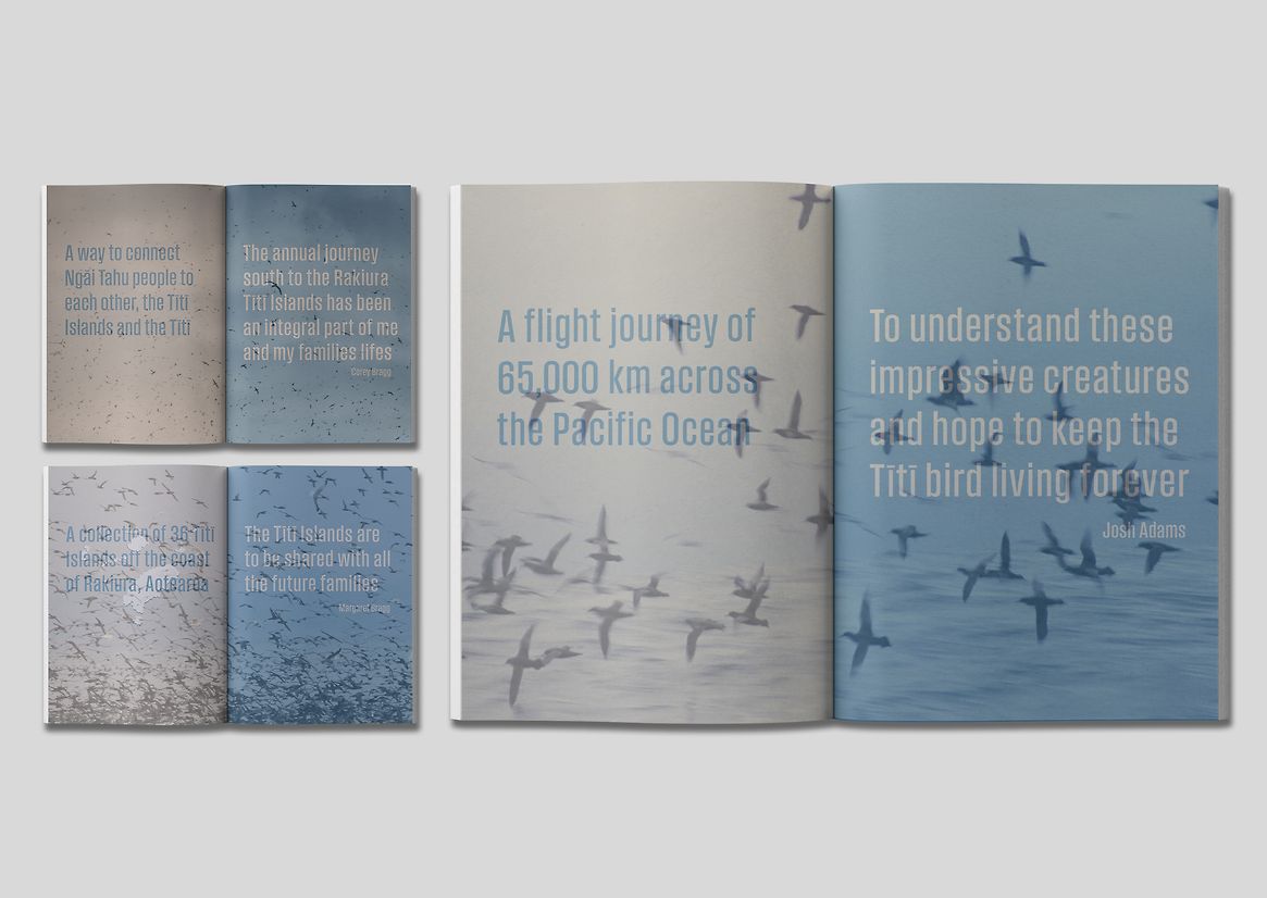 The typeface used is Field gothic and Aktiv grostic. These typefaces provide a neutral feel and draws inspiration from the Dorling Kindersley animal/nature books. The visual follows a story/journey narrative as it maps out an introduction to the tītī, its astounding migration feats, its nesting sites, how it forages for food, how it is harvested and processed, and its cultural significance. The colours used are inspired by the tītī’s environment; the use of blue from the ocean signifying its connection as sea bird and brown/ white from its feathers and down. Sections of the book include a transparent overlay to showcase swarms of tītī to create the experience of abundance and presence. The binding strategy is influenced by the pōhā, an airtight storage container made from rimurapa (bull kelp) that is wrapped in tōtara bark and carried inside a flax basket.